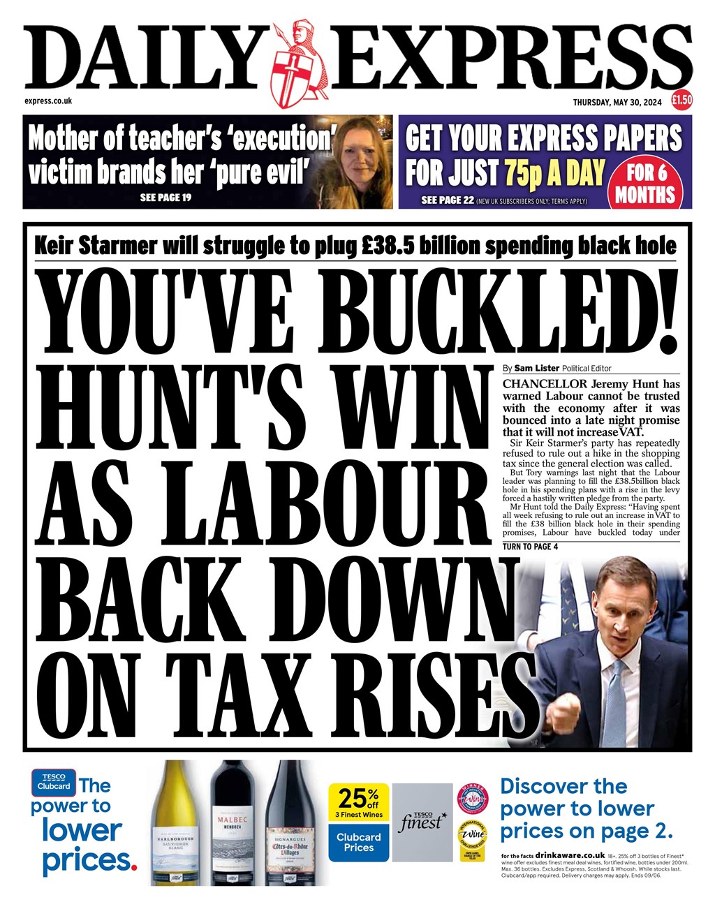 The Daily Express highlights Jeremy Hunt’s assertion that Labour is economically unreliable.