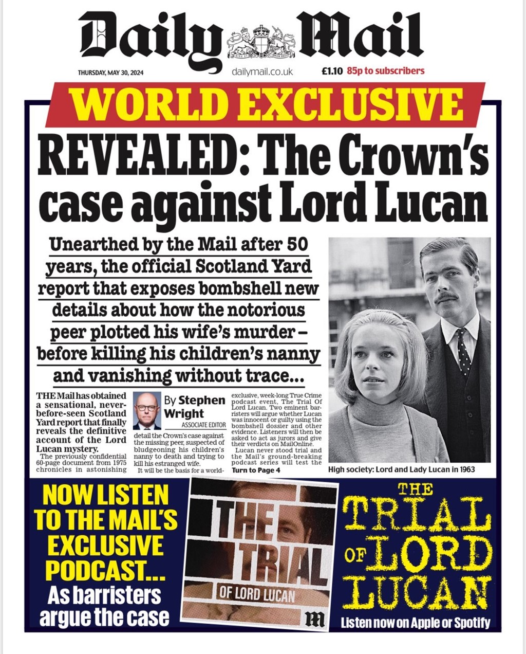 The Daily Mail reports on fresh details from a Scotland Yard report on the Lord Lucan case, who vanished in 1974 under murder suspicions.