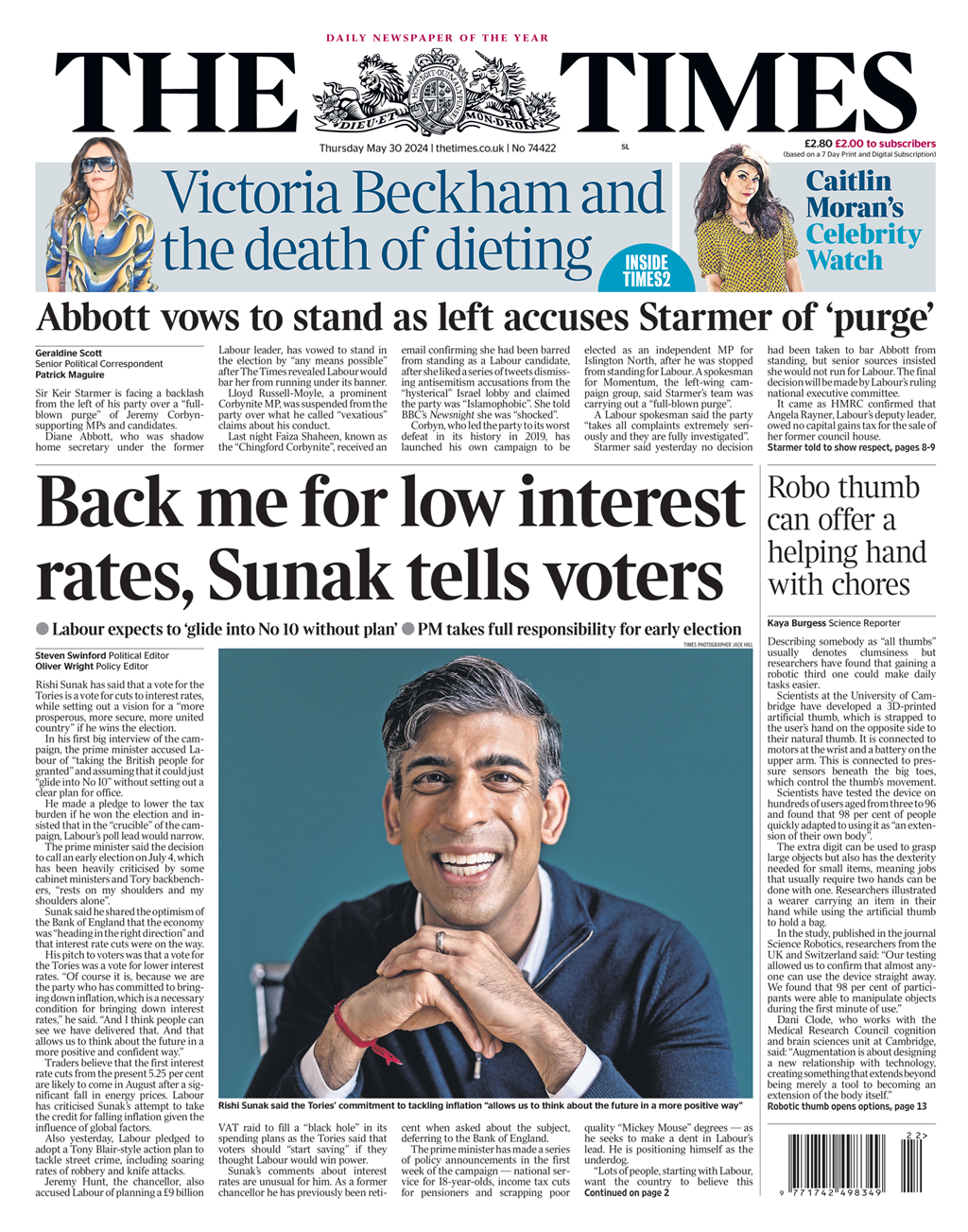 The Times reports on Rishi Sunak’s promise of reduced interest rates under a Tory government.