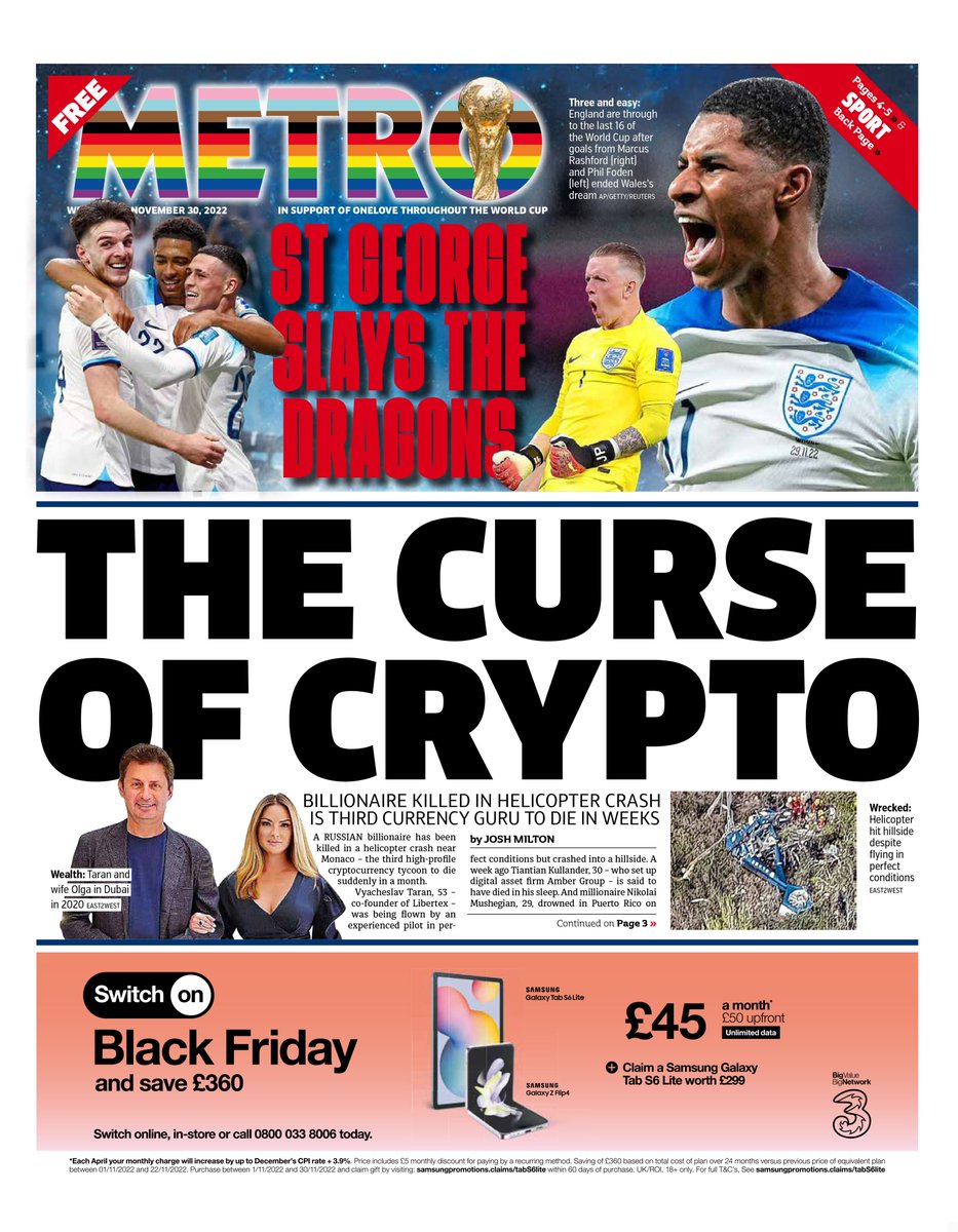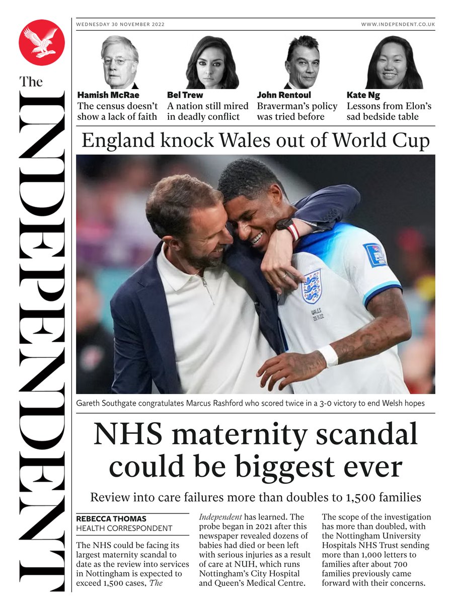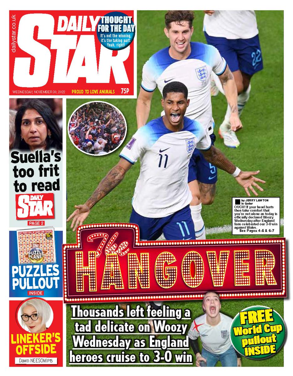 Featured on the front page of the Daily Star is England’s World Cup victory over Wales.