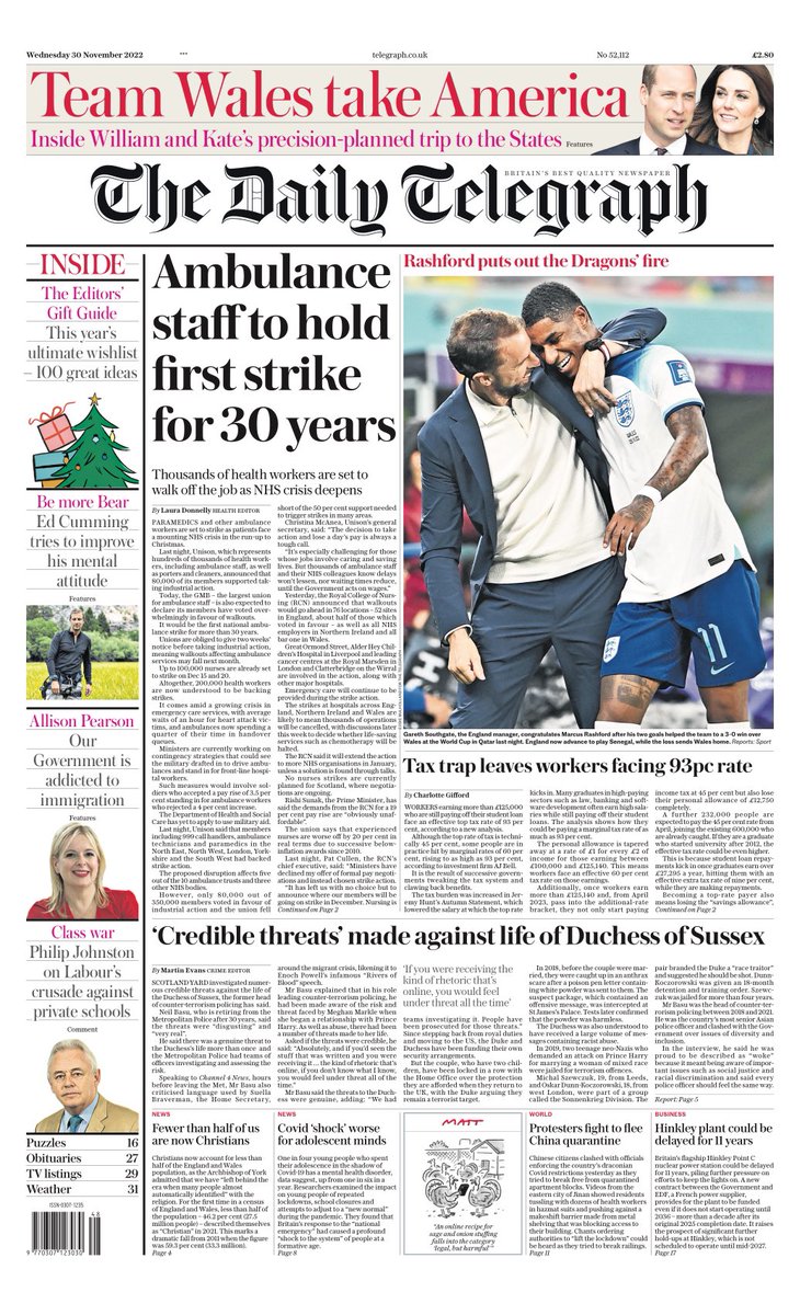 The Daily Telegraph reports on the first ambulance strike in 30 years.