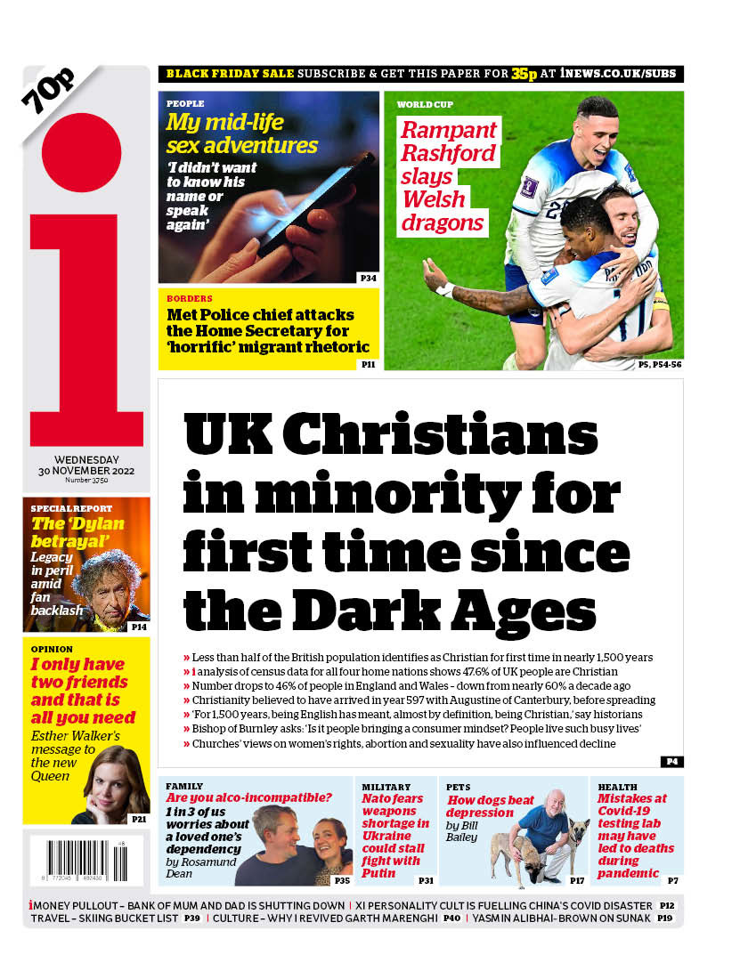 According to the i, less than half of the UK population is Christian for the first time since the Dark Ages.
