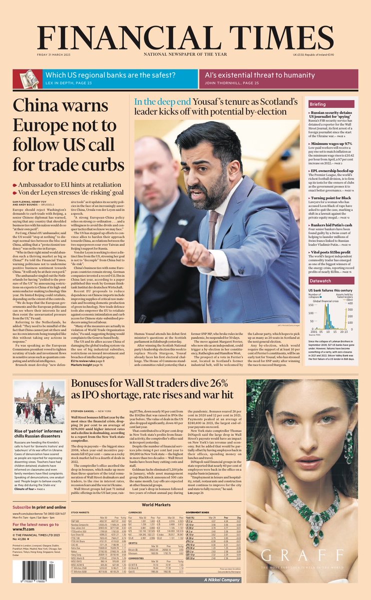 FT reports on China’s warning to Europe not to abide by US calls to limit trade with the Asian country.