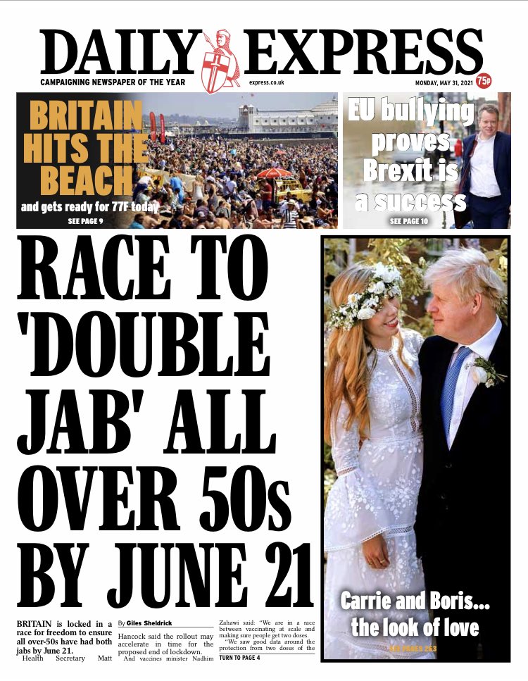 The Daily Express reports on the race to offer all over 50s a second COVID-19 jab by 21 June, when it is hoped that restrictions in England will end.