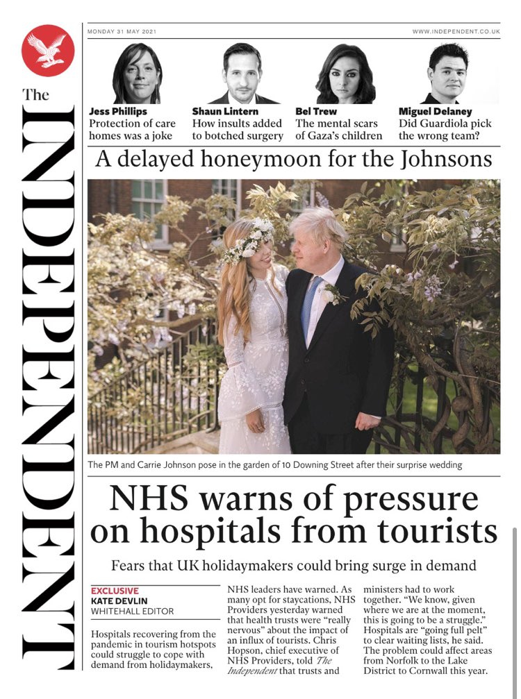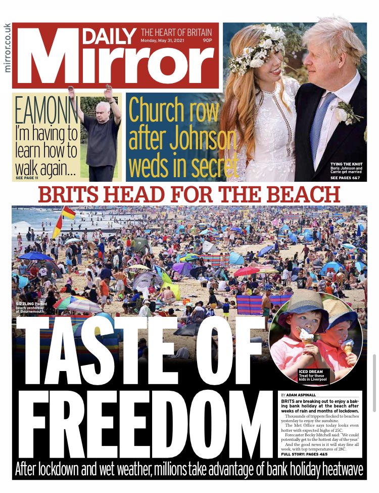 Britons take advantage of some decent weather after lockdown and weeks of rain – that’s on the front of the Daily Mirror.