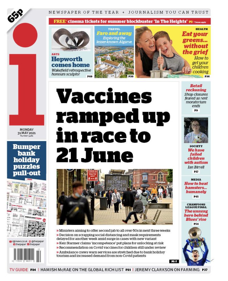 The i reports that ministers are aiming to offer a second COVID-19 vaccine dose to all over 50s in the next three weeks.