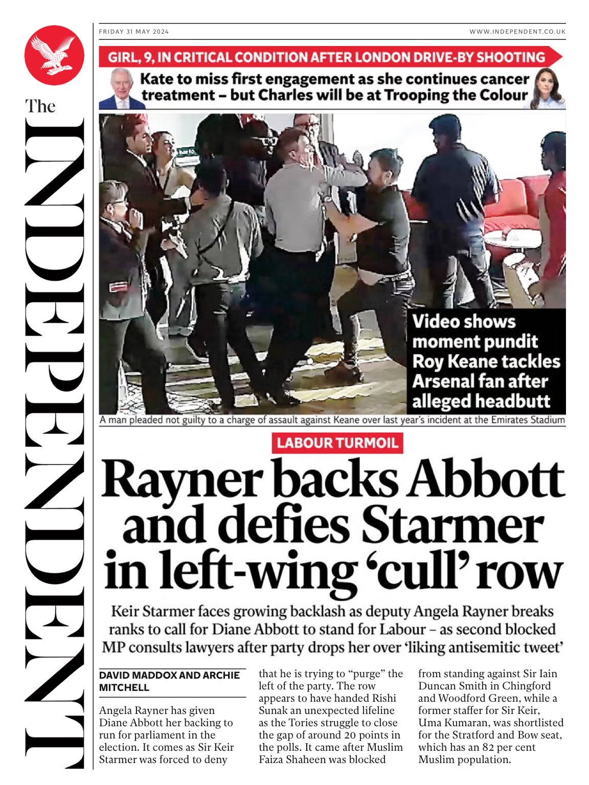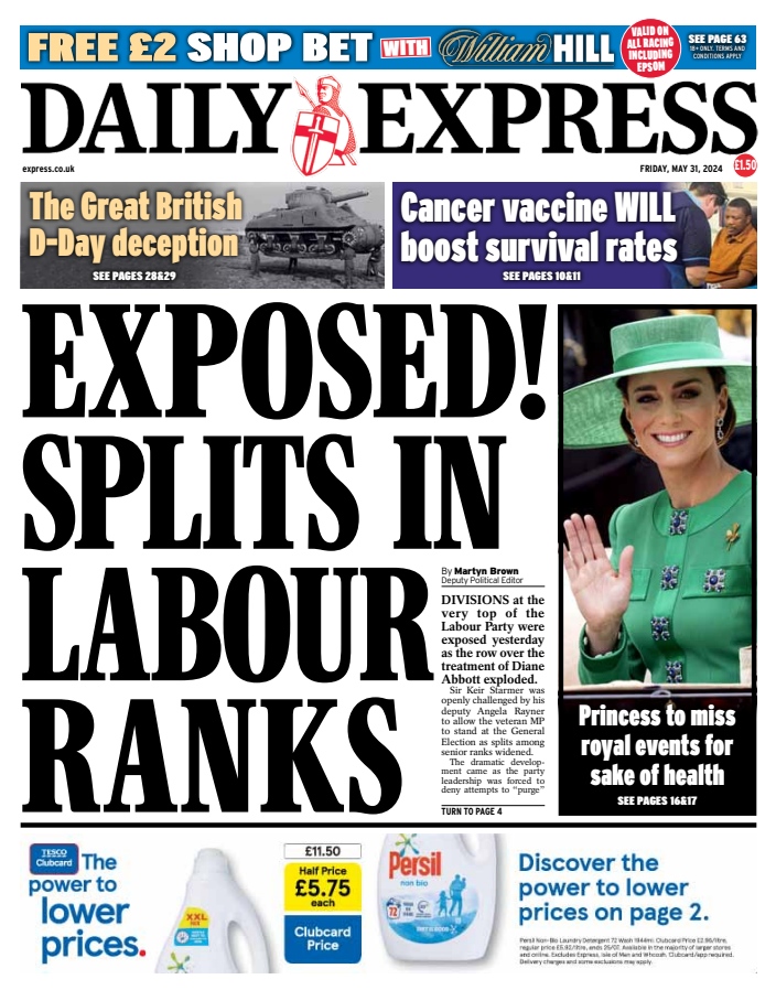 The Daily Express reveals discord within Labour’s top ranks over Diane Abbott’s treatment.