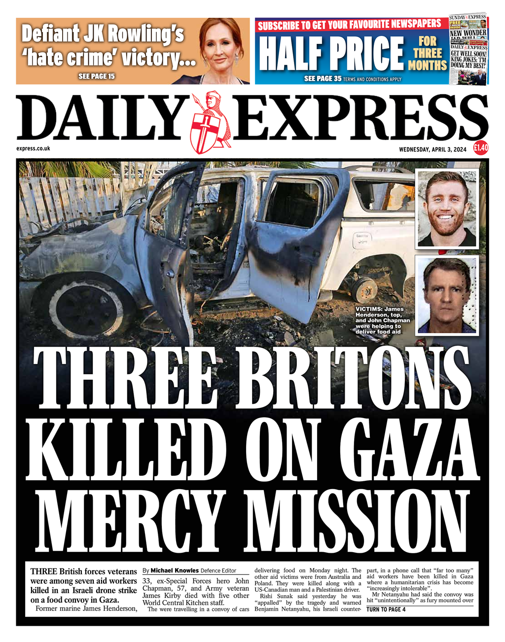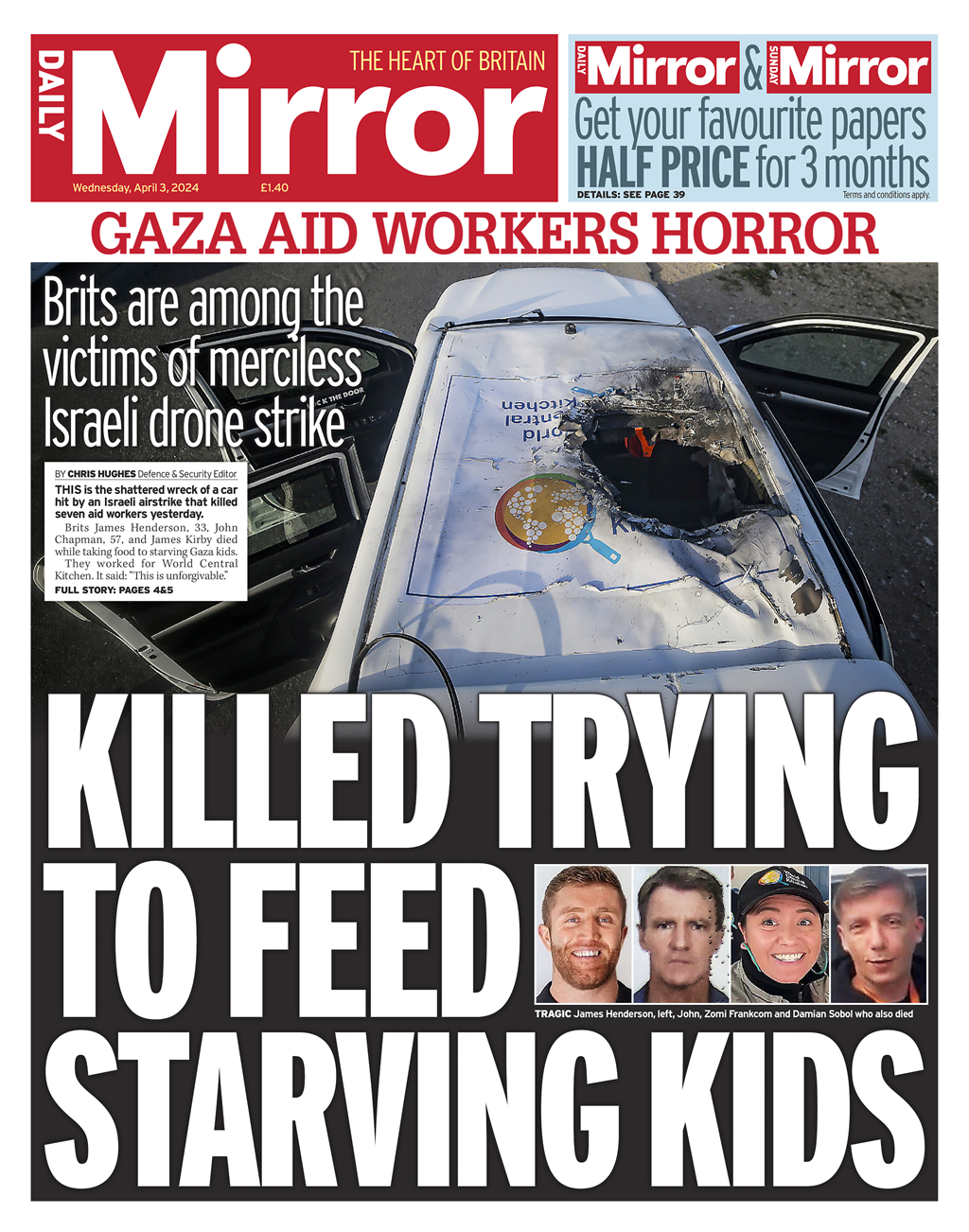The Daily Express reports on the tragic death of three British aid workers in an Israeli drone strike in Gaza.