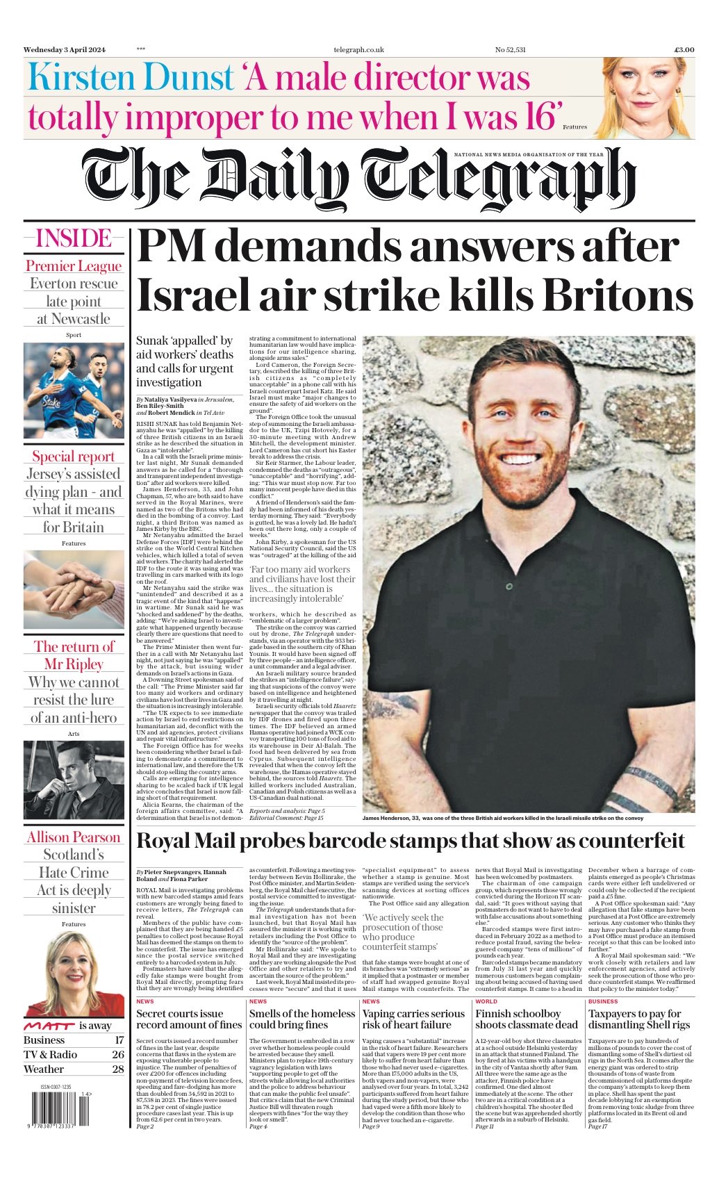 The Daily Telegraph reports on PM Rishi Sunak expressing his outrage to Israel’s Benjamin Netanyahu over the death of three Britons in an Israeli airstrike.