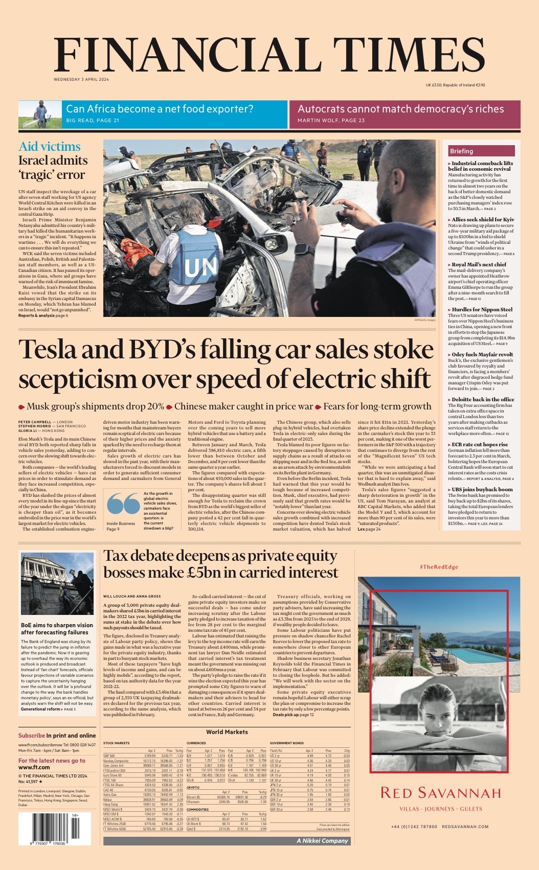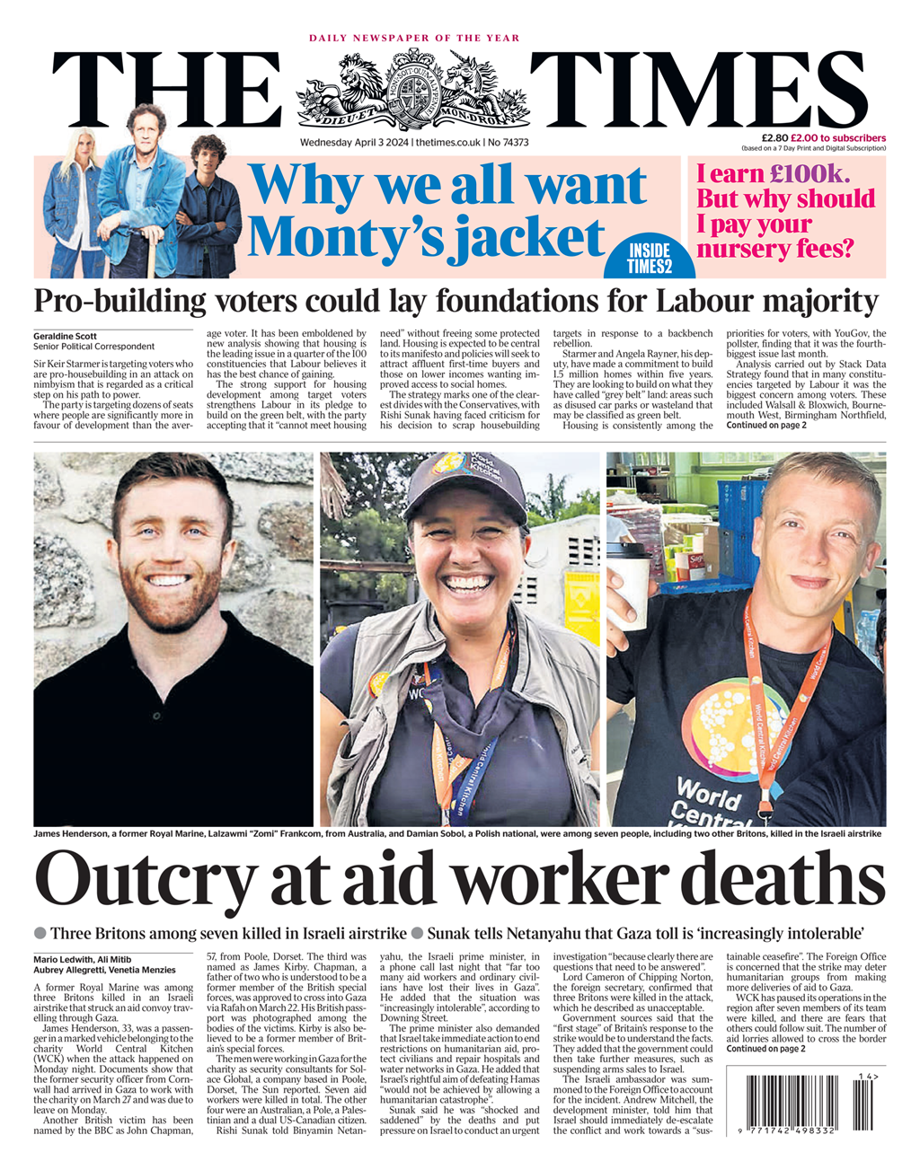 The Times reports on the public outrage following the death of three British aid workers in an Israeli airstrike.