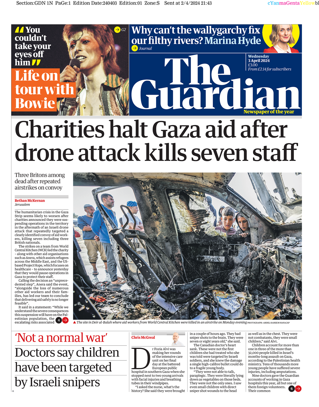 The Guardian highlights the suspension of charity operations in Gaza following an Israeli airstrike that claimed seven aid workers’ lives.
