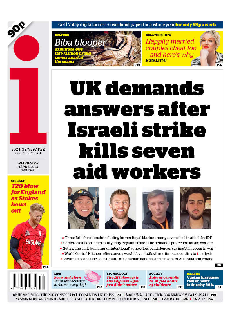 The i highlights the UK’s demand for answers after an Israeli airstrike killed three British aid workers.