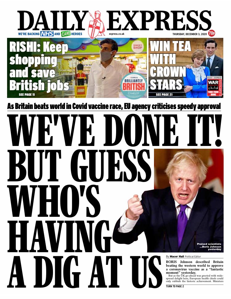 The Daily Express leads on the UK’s vaccine success being rubbished by EU health chiefs.