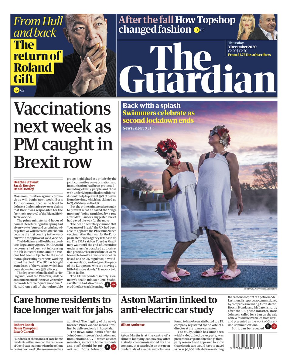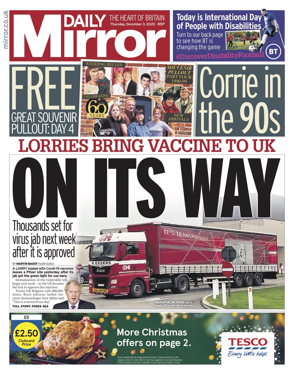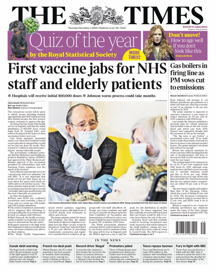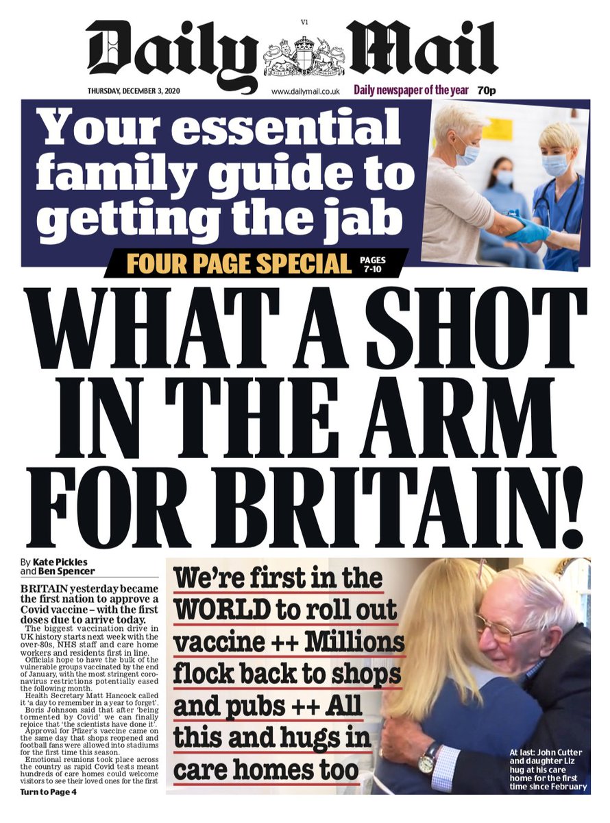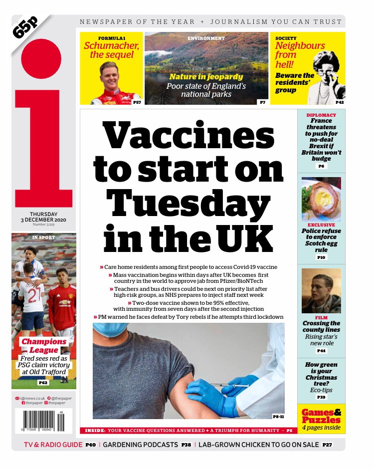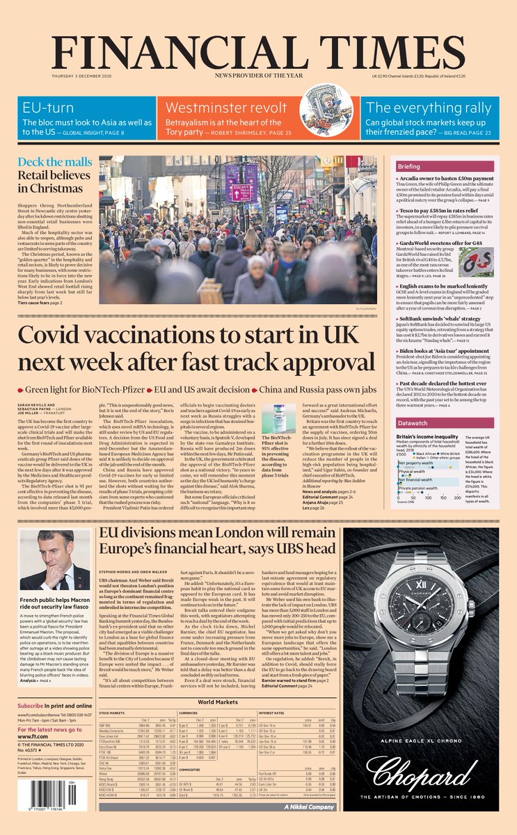 COVID vaccinations beginning in the UK next week, after regulators gave the green light to the Pfizer/ BioNTech jab, leads the front of the Financial Times.