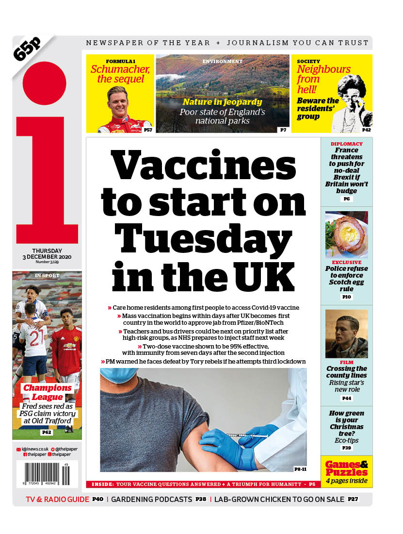 The i paper reports vaccines will start on Tuesday – with care homes among the first to get a jab.