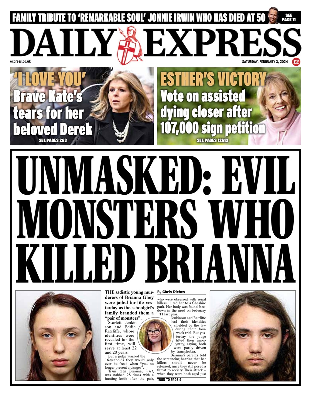 The Daily Express reports on the life imprisonment of Brianna Ghey’s young killers, labelled as “monsters” by her family.