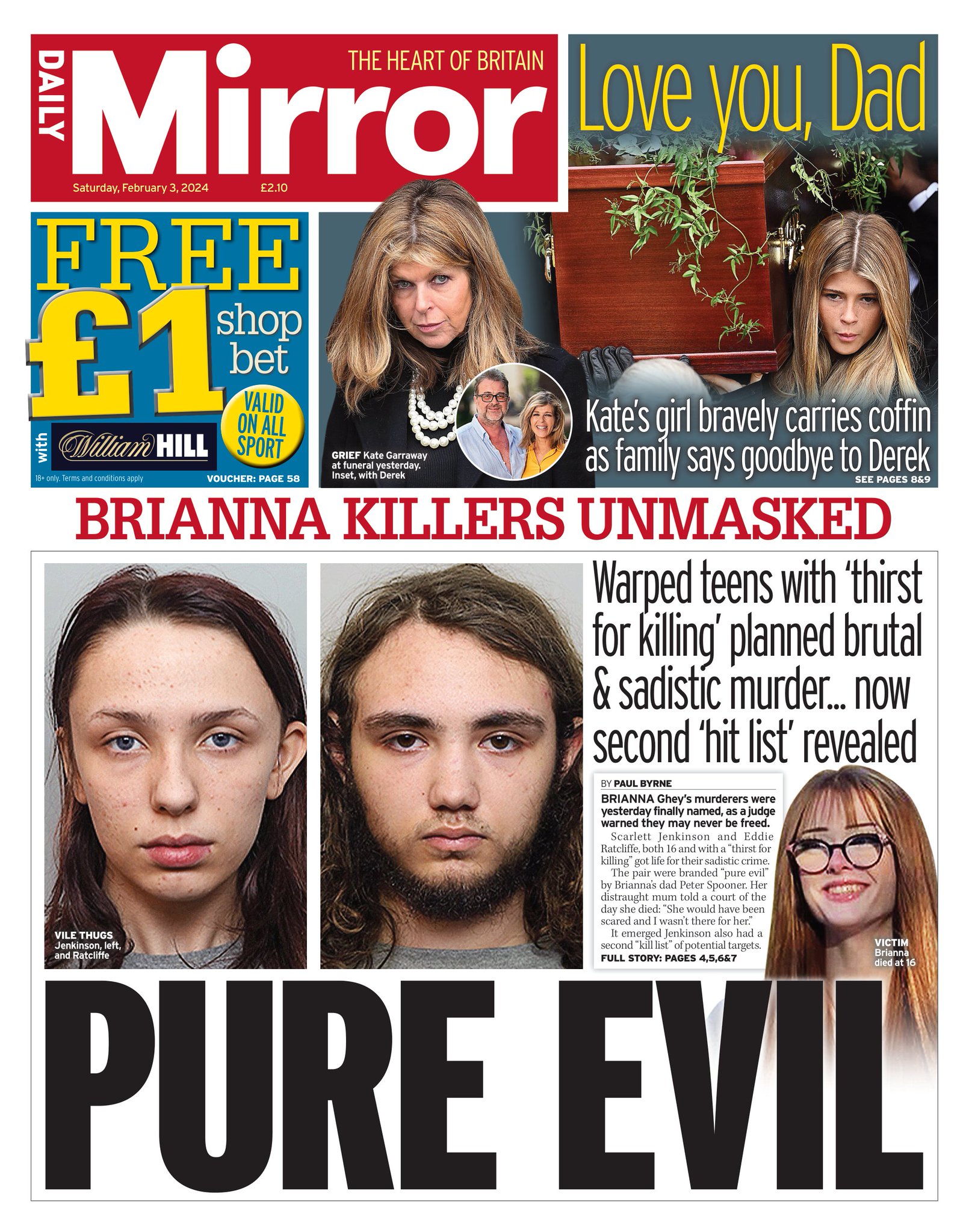 The Daily Mirror leads with the story of Brianna Ghey’s killers, Scarlett Jenkinson and Eddie Radcliffe, receiving lengthy prison sentences.