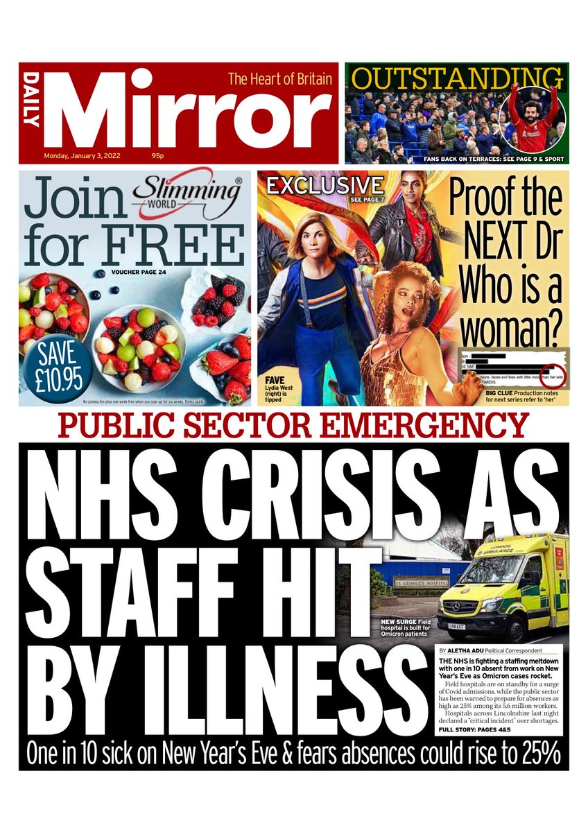 One in 10 NHS staff were absent on New Year’s Eve and there are fears absences could rise to 25%, reports the Daily Mirror.