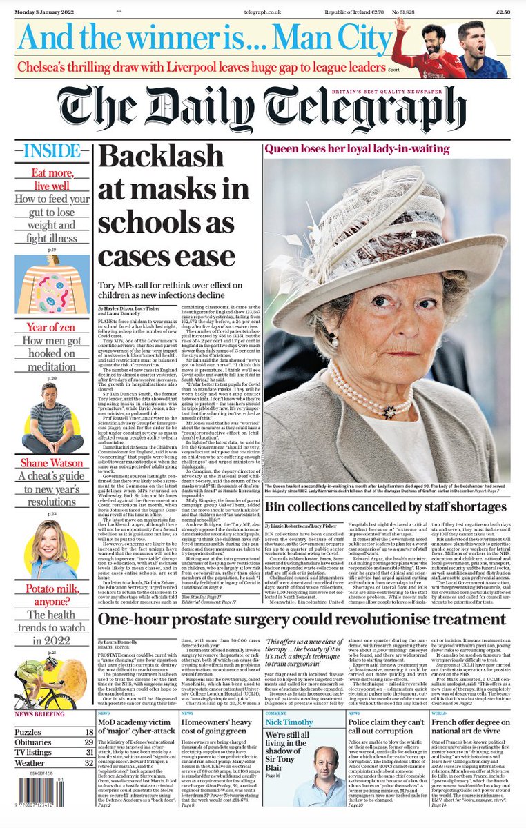 The Daily Telegraph writes that the government’s plan to force children to wear a face mask while at school faces a backlash.
