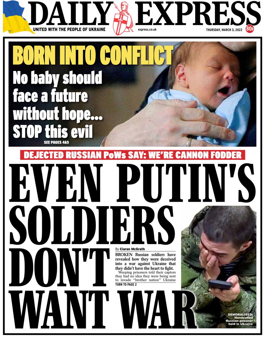 The Daily Mirror has a photo of a baby born in a bomb shelter as Vladimir Putin continues his assault on the city above.