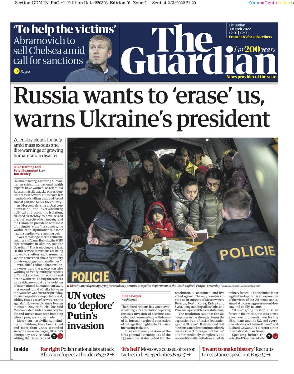 The Guardian leads with the Ukrainian president’s warning that Russia wants to “erase” the people of Ukraine.