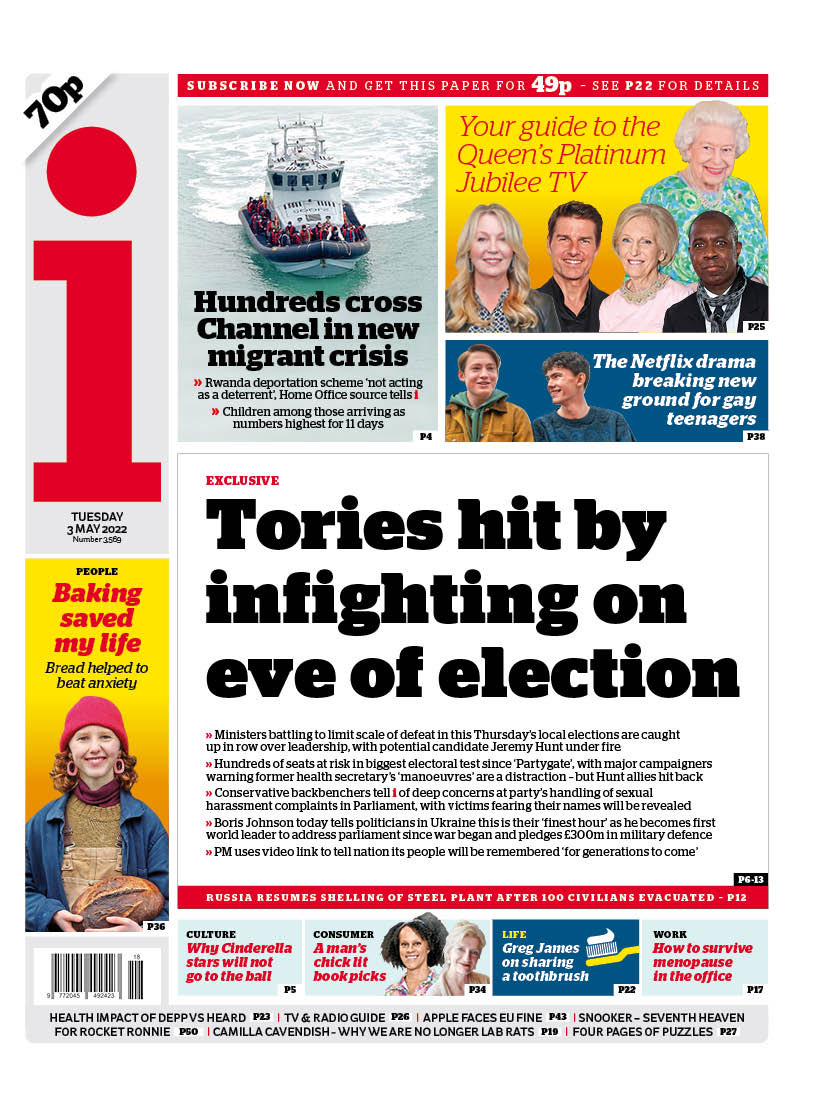The i reports that there is infighting within the Conservative Party on the eve of the election.