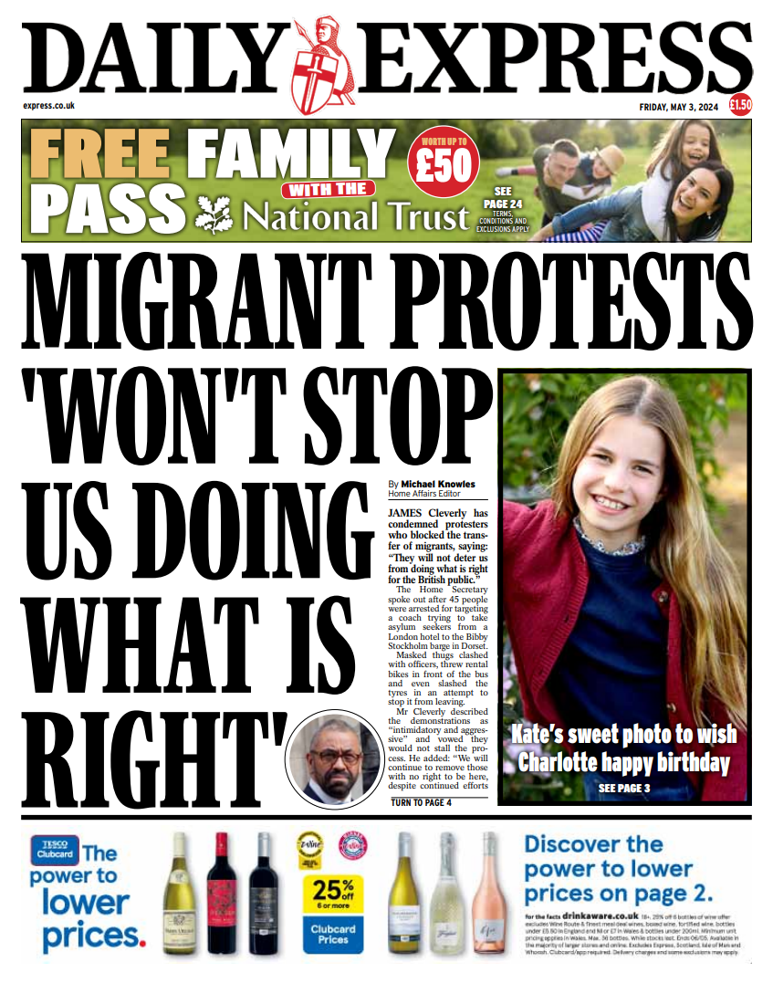 The Daily Express reports Home Secretary James Cleverly’s firm stance on continuing migrant deportations despite protests.
