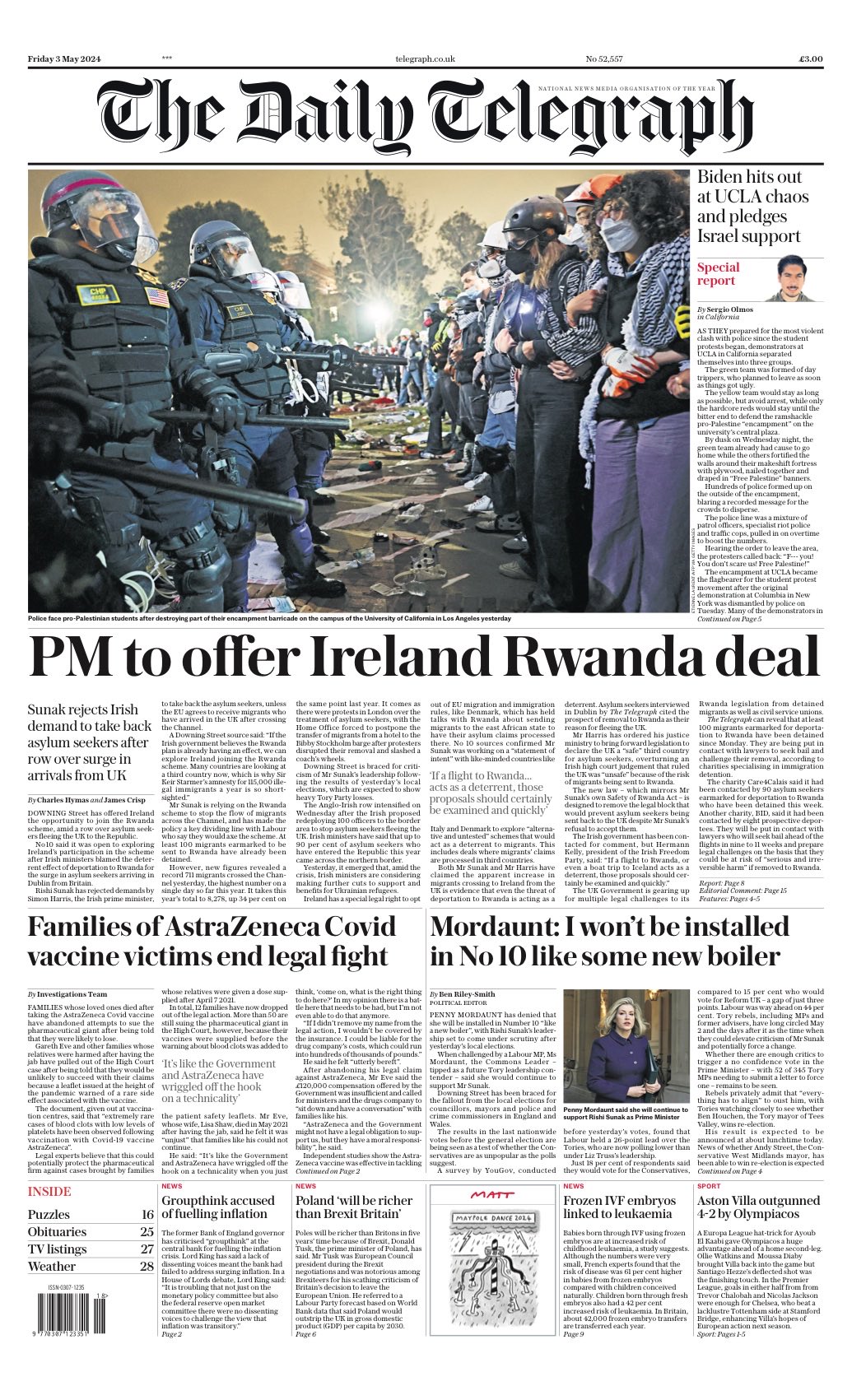 The Daily Telegraph reveals Rishi Sunak’s invitation to Ireland to join the Rwanda deportation scheme.