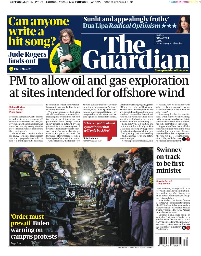 The Guardian reports that Rishi Sunak may permit oil and gas exploration at offshore wind energy sites.