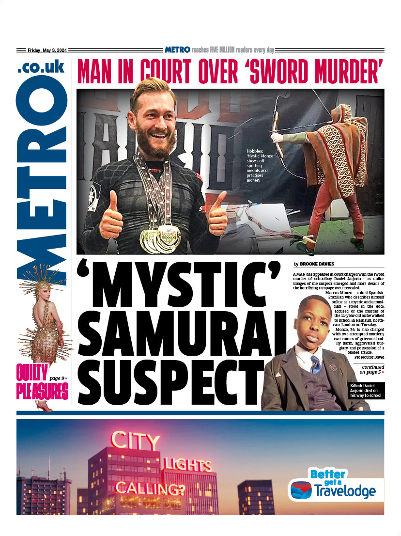 The Metro reports on a man charged with the sword murder of a 14-year-old boy in Hainault, London.
