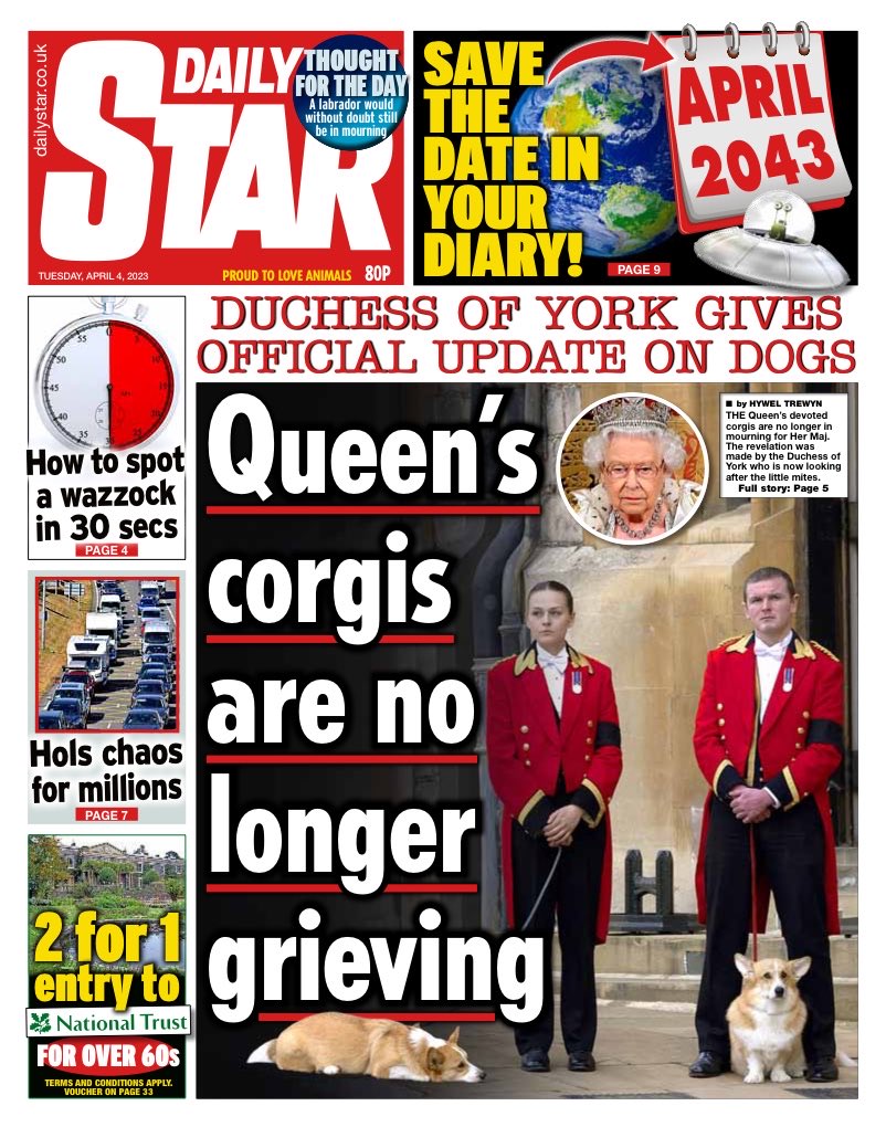 In the Daily Star, the Duchess of York reports that the Queen’s devoted corgis are no longer in mourning.