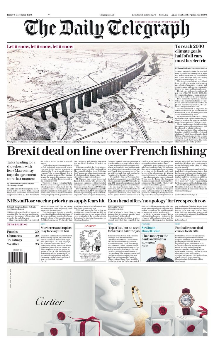 Tomorrow’s Daily Express leads with a story about Brexit talks hitting a block at the eleventh hour over subsidies.