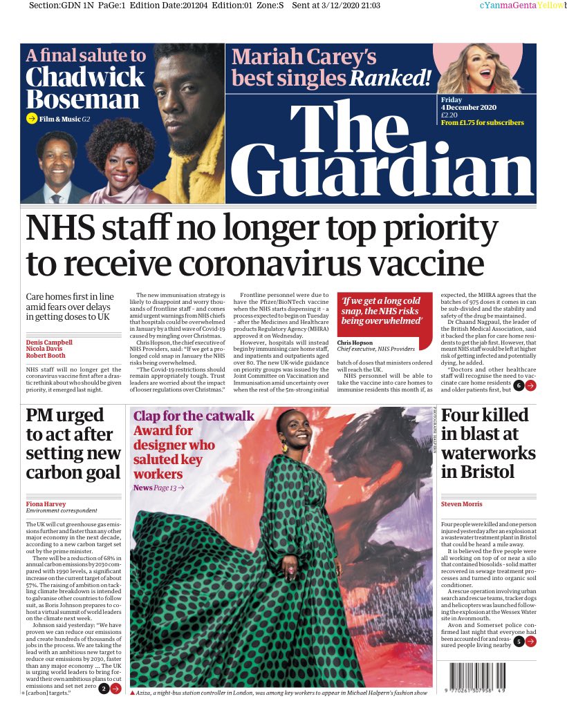 NHS staff have been replaced by care homes at the top of the priority list for the coronavirus vaccine, The Guardian reports.