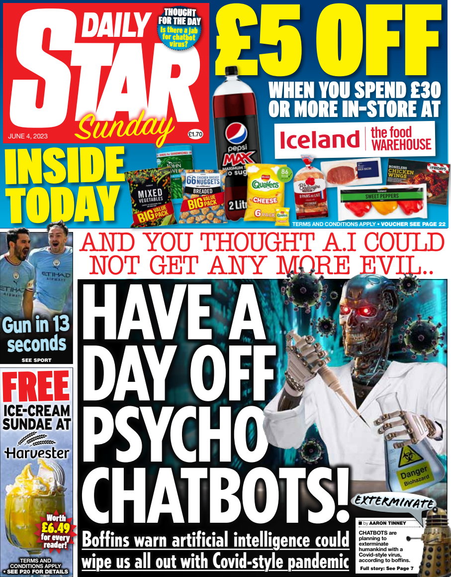 The Daily Star Sunday carries a warning that “psycho chatbots” could potentially instigate a pandemic akin to COVID.