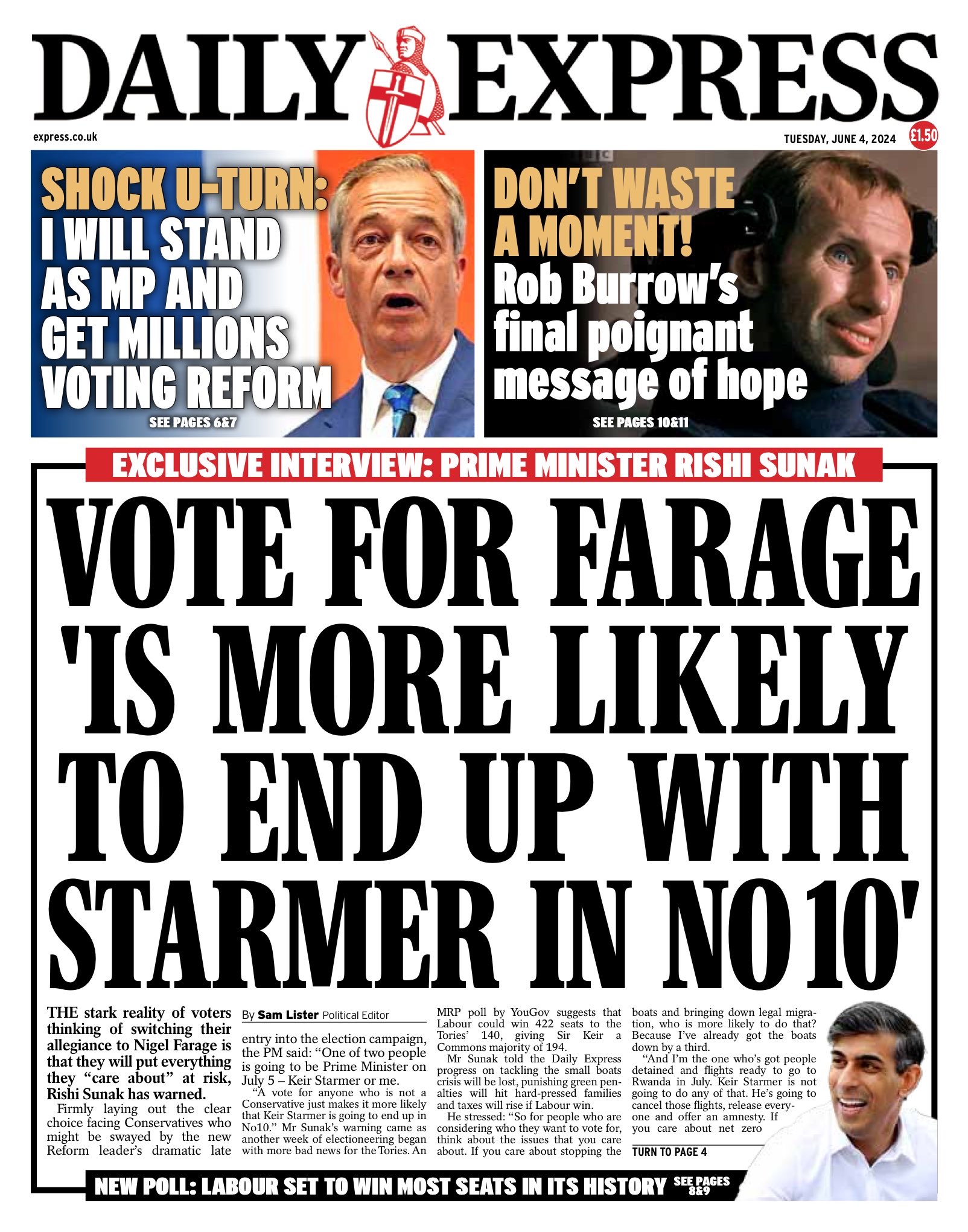 Prime Minister Rishi Sunak has warned voters that switching their support to Nigel Farage’s party could result in Labour leader Keir Starmer becoming the next Prime Minister.