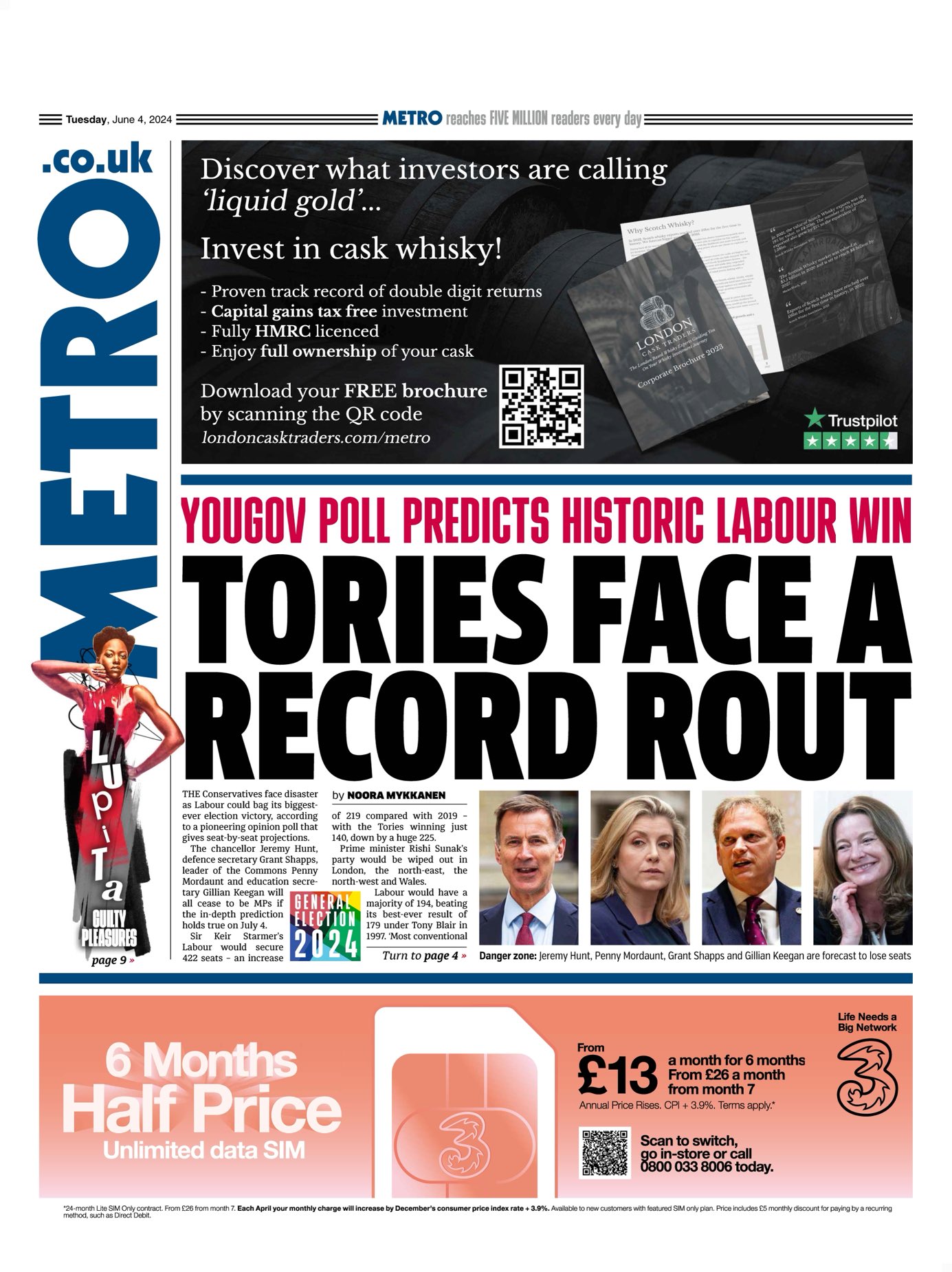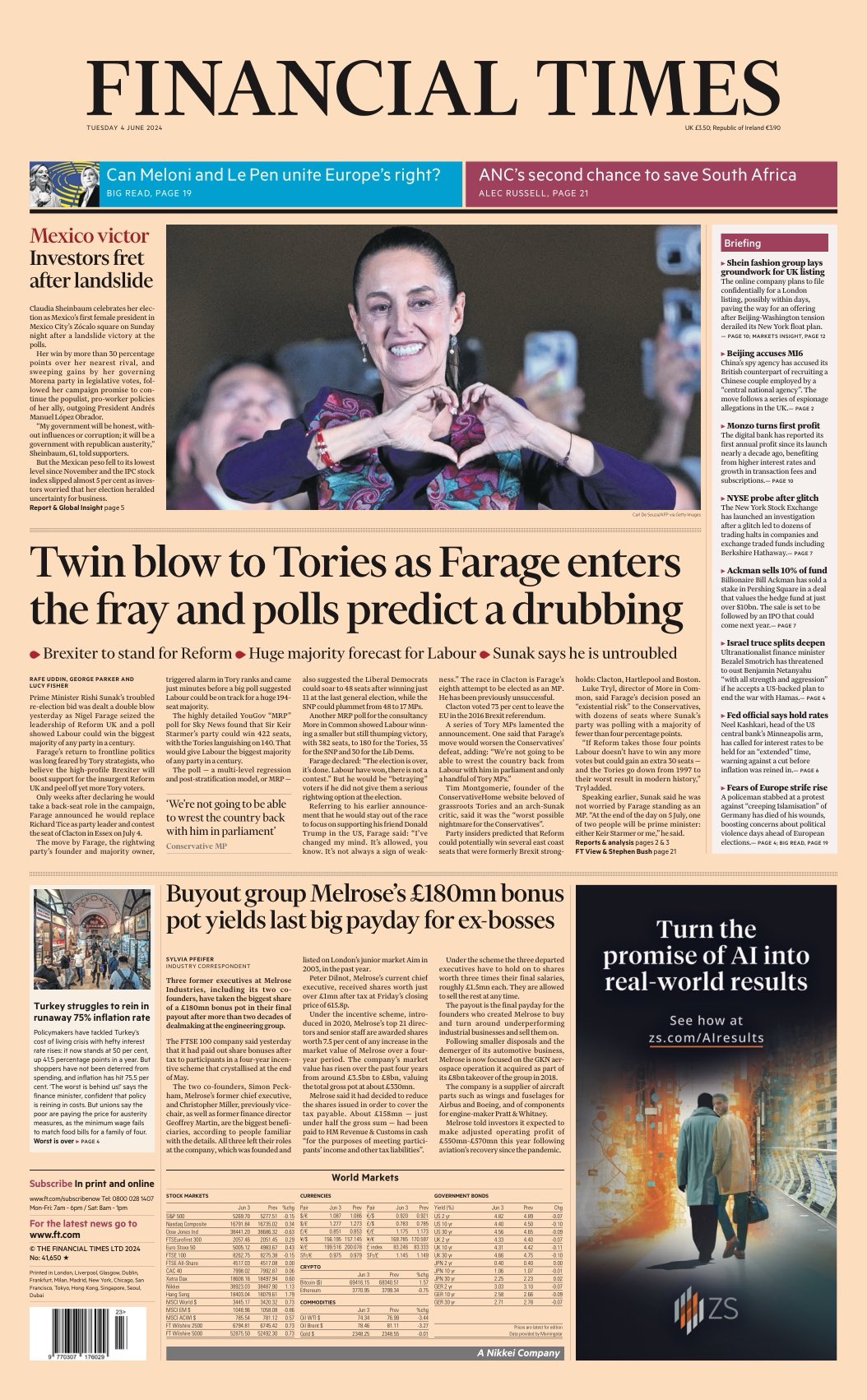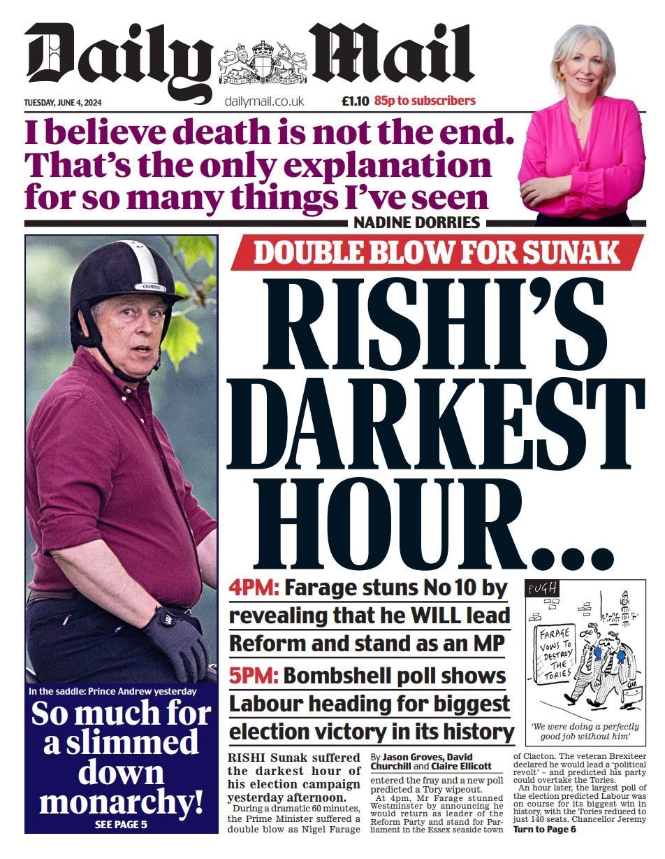 The Daily Mail reports on the prime minister’s election campaign hitting a low point as Nigel Farage takes the lead of Reform and Labour surges in the polls.