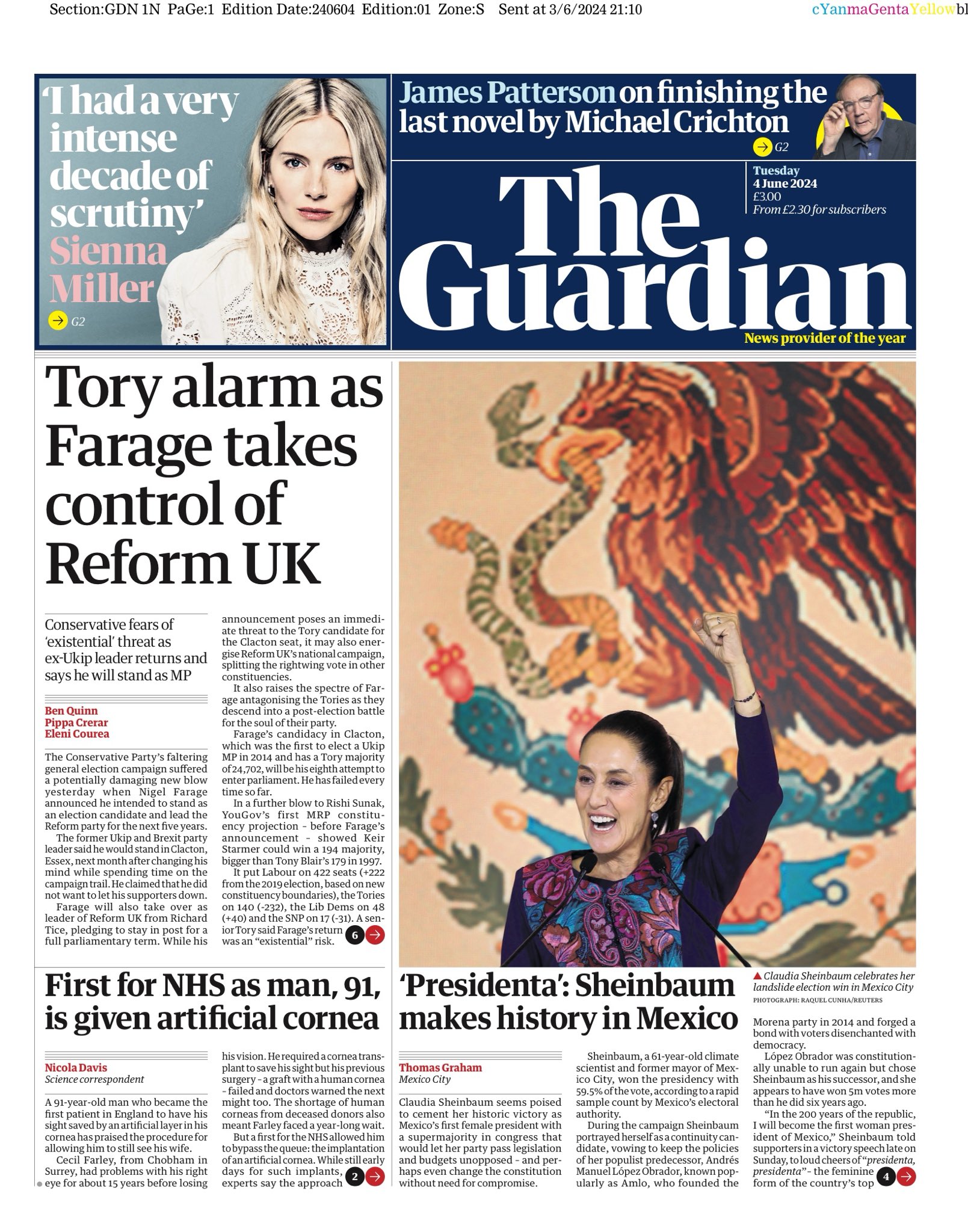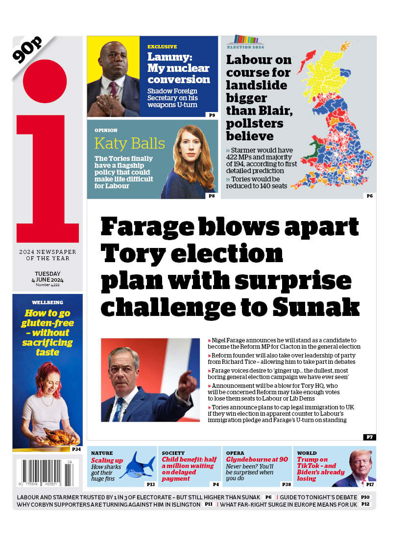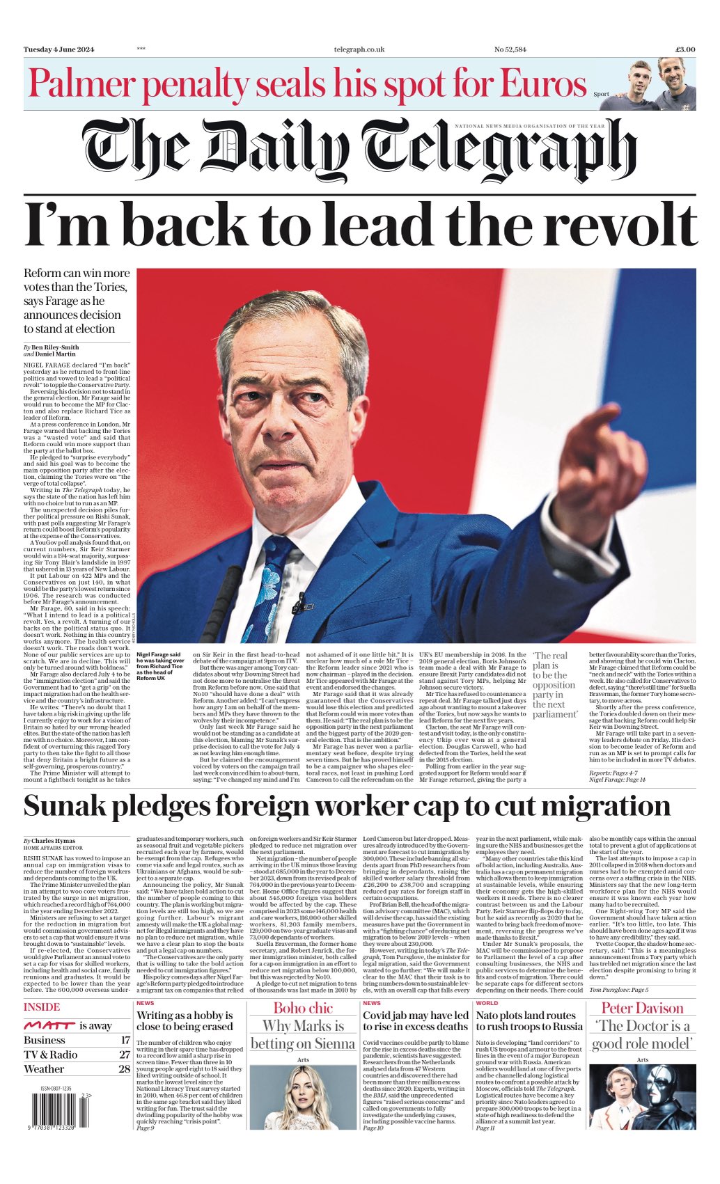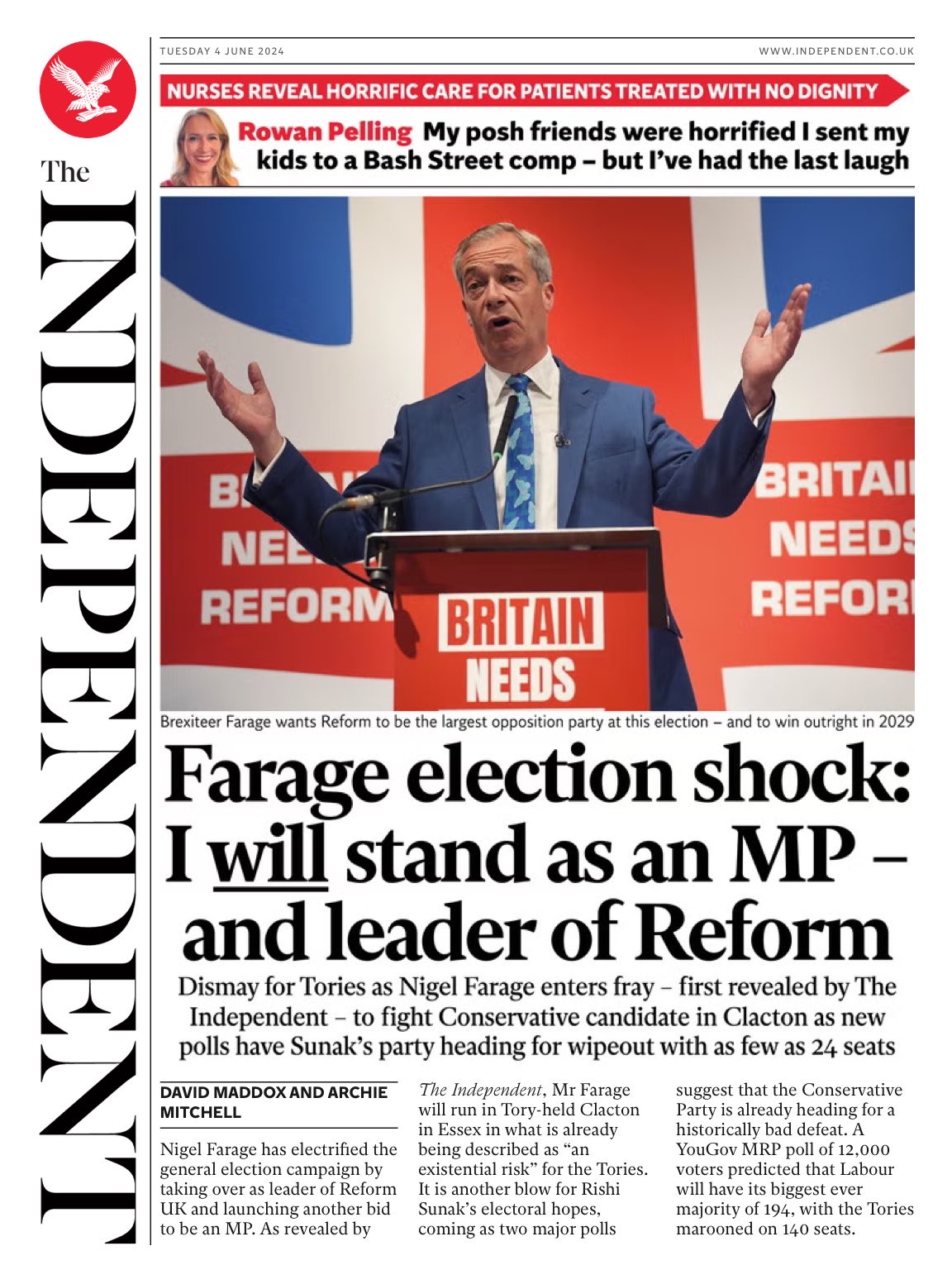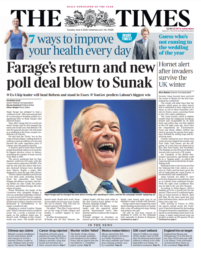 The Daily Mirror reports on a challenging day for the prime minister as Nigel Farage’s return threatens to divide the Tory vote in the upcoming general election.