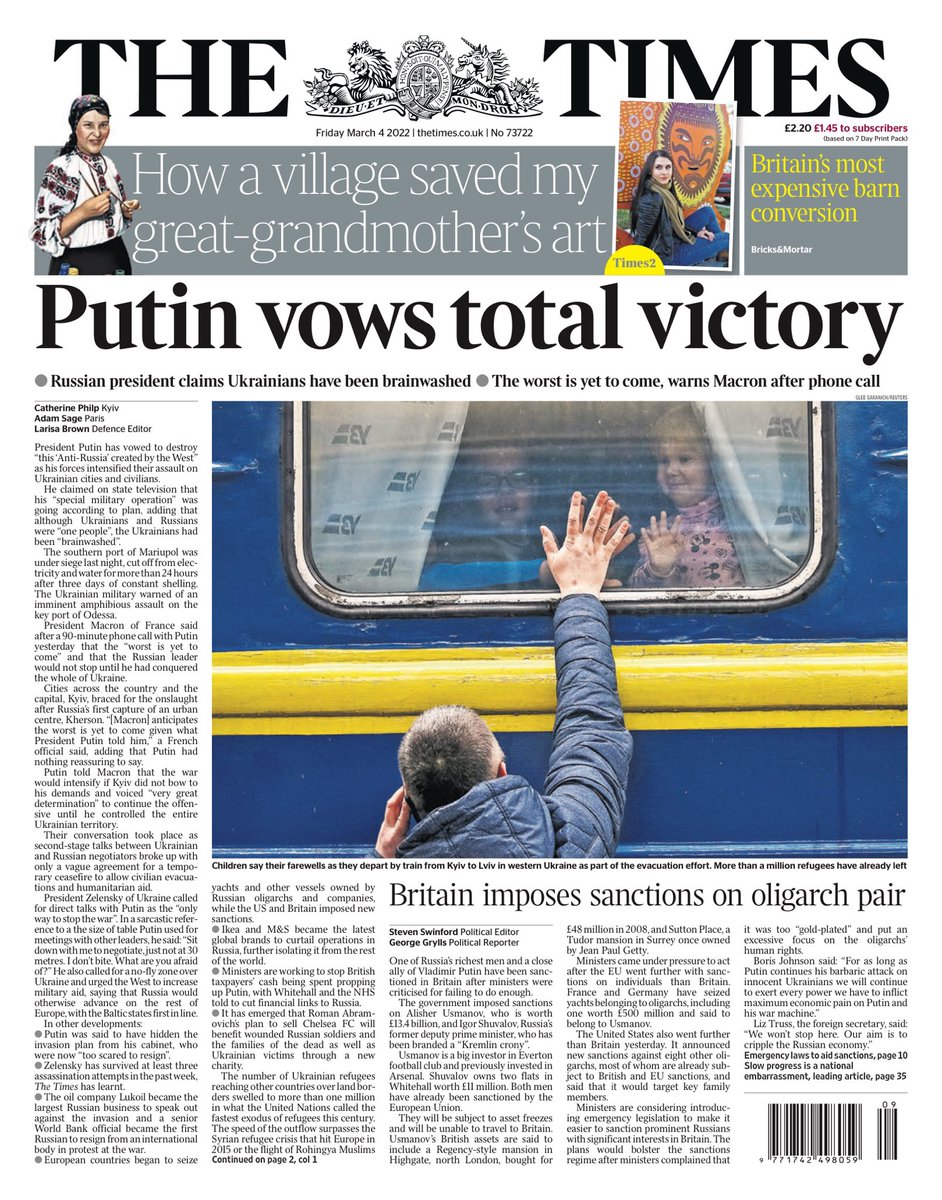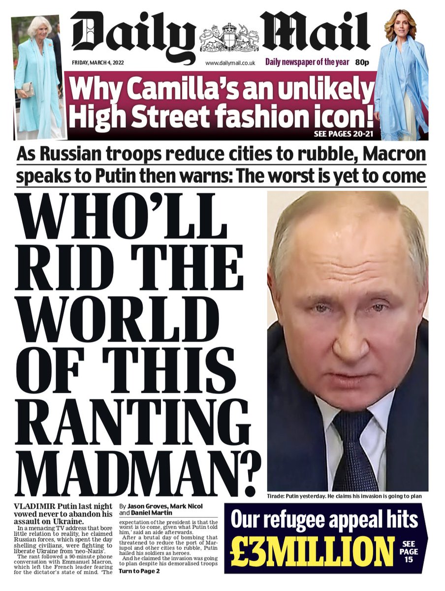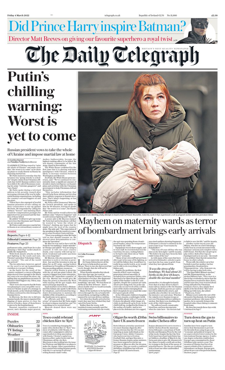 The Daily Telegraph front reports that Vladimir Putin has vowed to “seize the whole of Ukraine” and has imposed martial law at home.