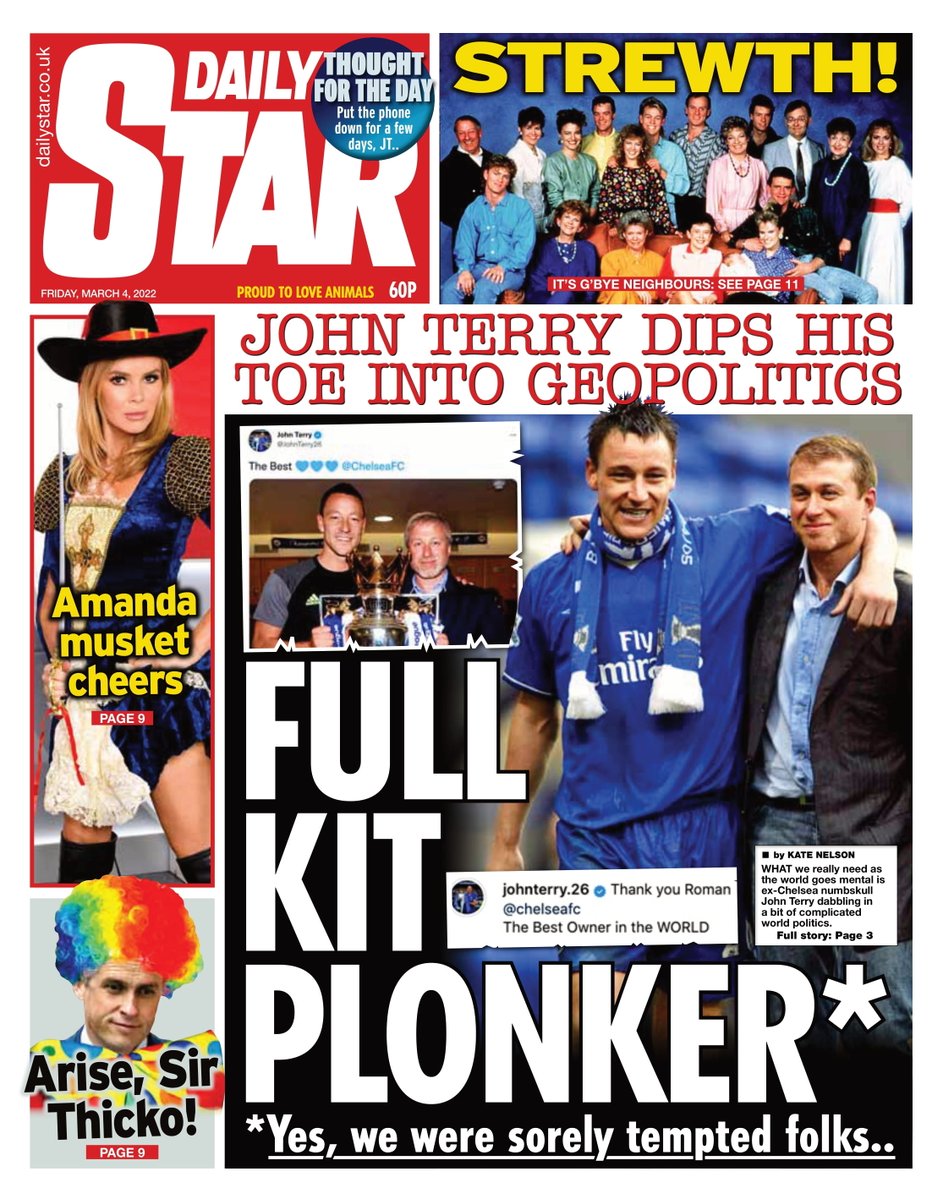 The Daily Star leads on John Terry’s tribute to Chelsea owner Roman Abramovich, whom he called “the best”.