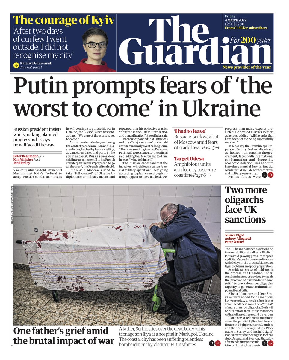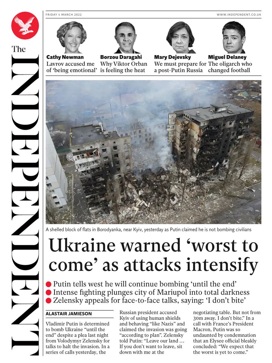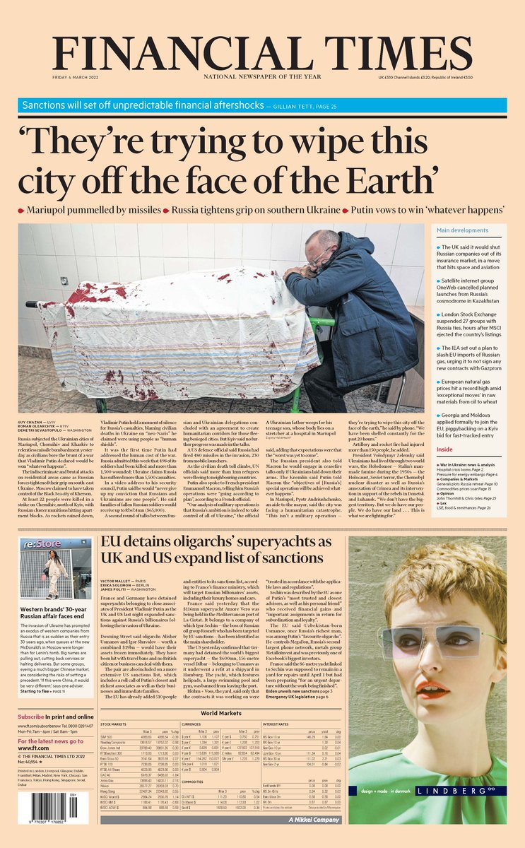 The Financial Times leads on the Russian bombardment of Mariupol, Chernihiv and Kharkiv, with civilians bearing the brunt of the war.