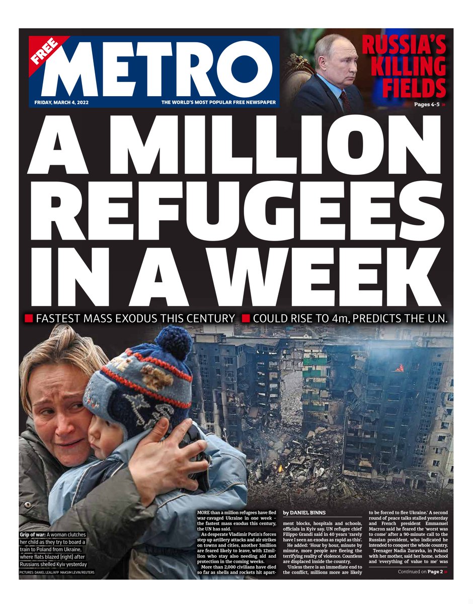 The Metro reports more than a million refugees have fled war-ravaged Ukraine in one week – the fastest mass exodus this century, the UN has said.