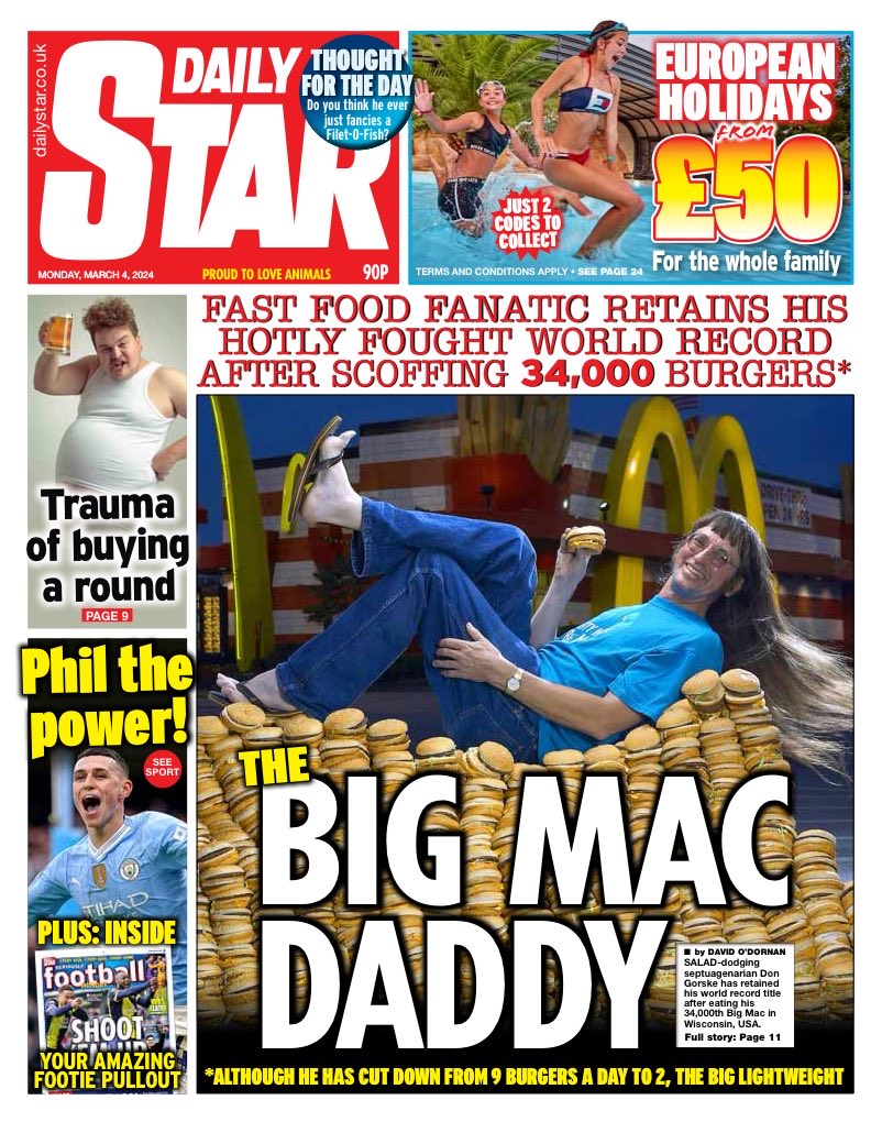 The Daily Star reports on a man in the US who has maintained his title as the Big Mac king by consuming his 34,000th burger.