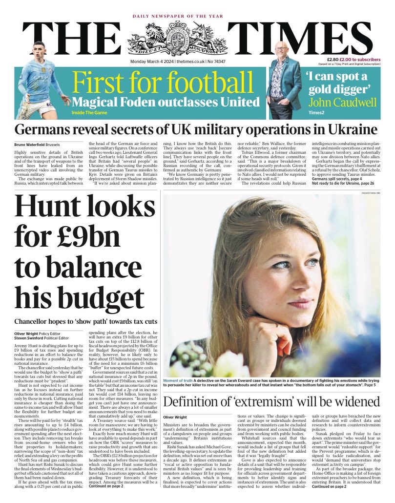 The Times reports the chancellor’s plan to fund a potential 2p reduction in national insurance in the upcoming budget.