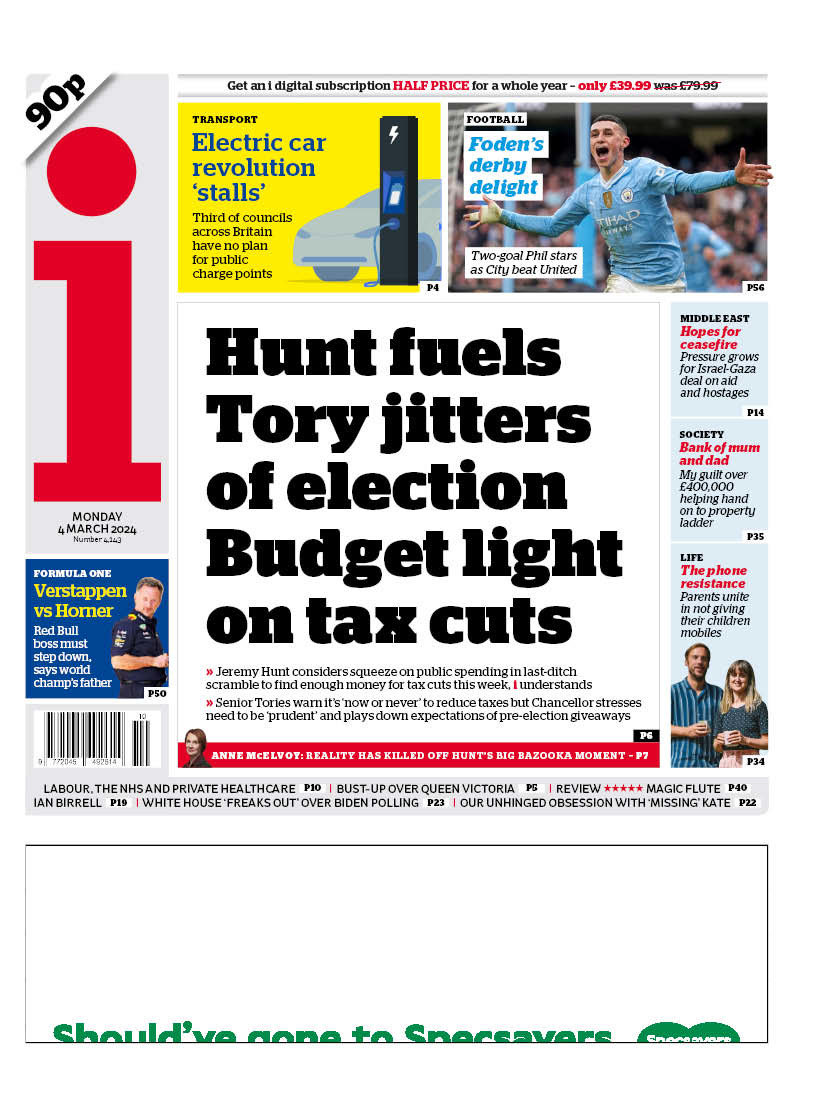 The i newspaper predicts the chancellor may cut public spending to enable tax reductions.