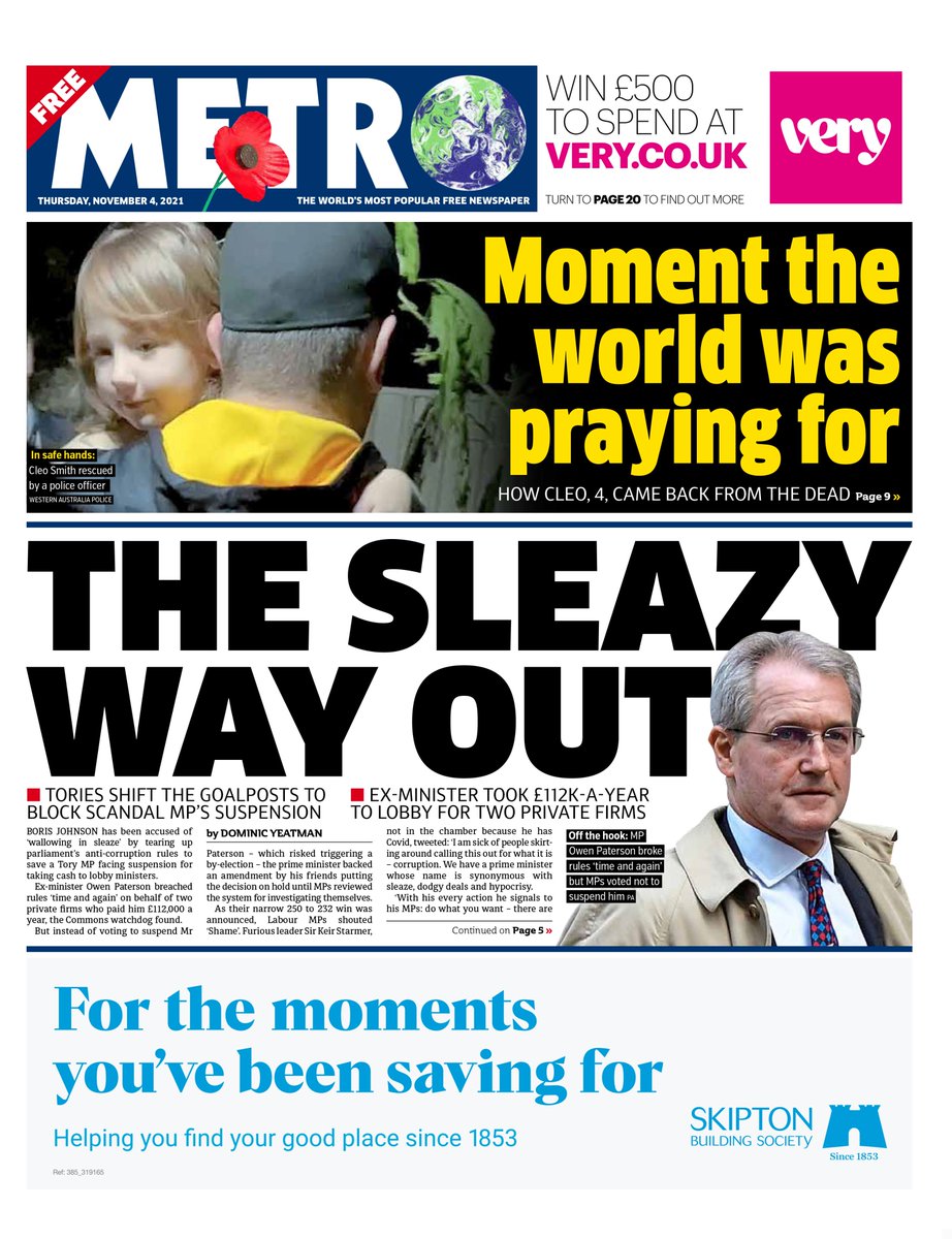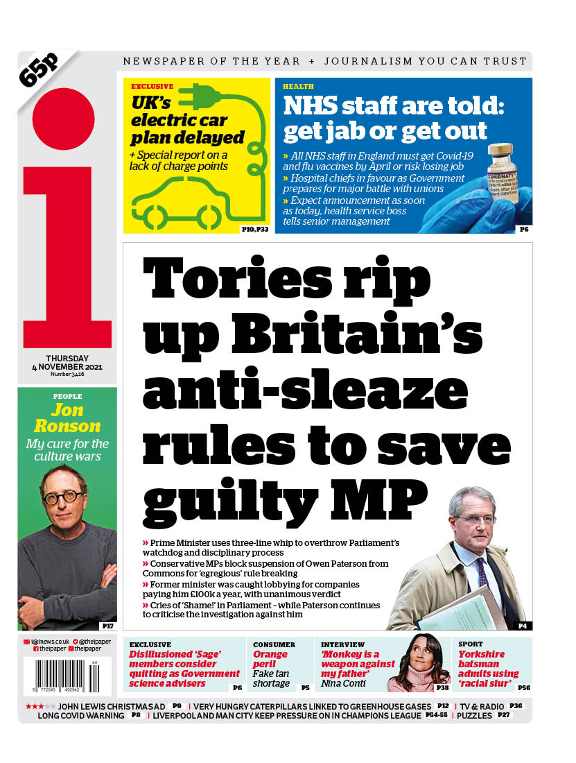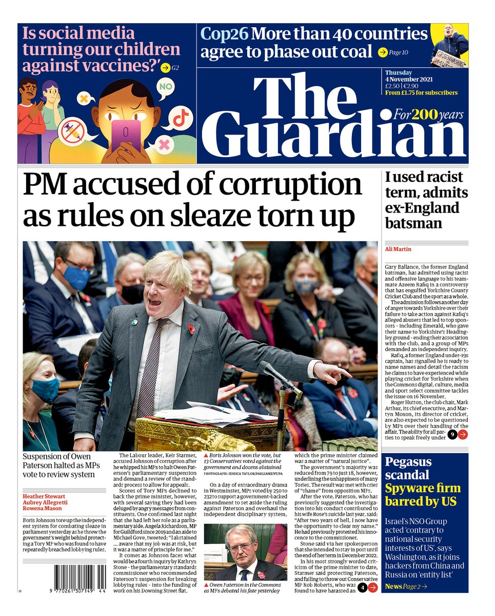 Boris Johnson protecting MP Owen Paterson, who was found to have repeatedly breached lobbying rules, from being suspended also makes the front page of The Guardian.