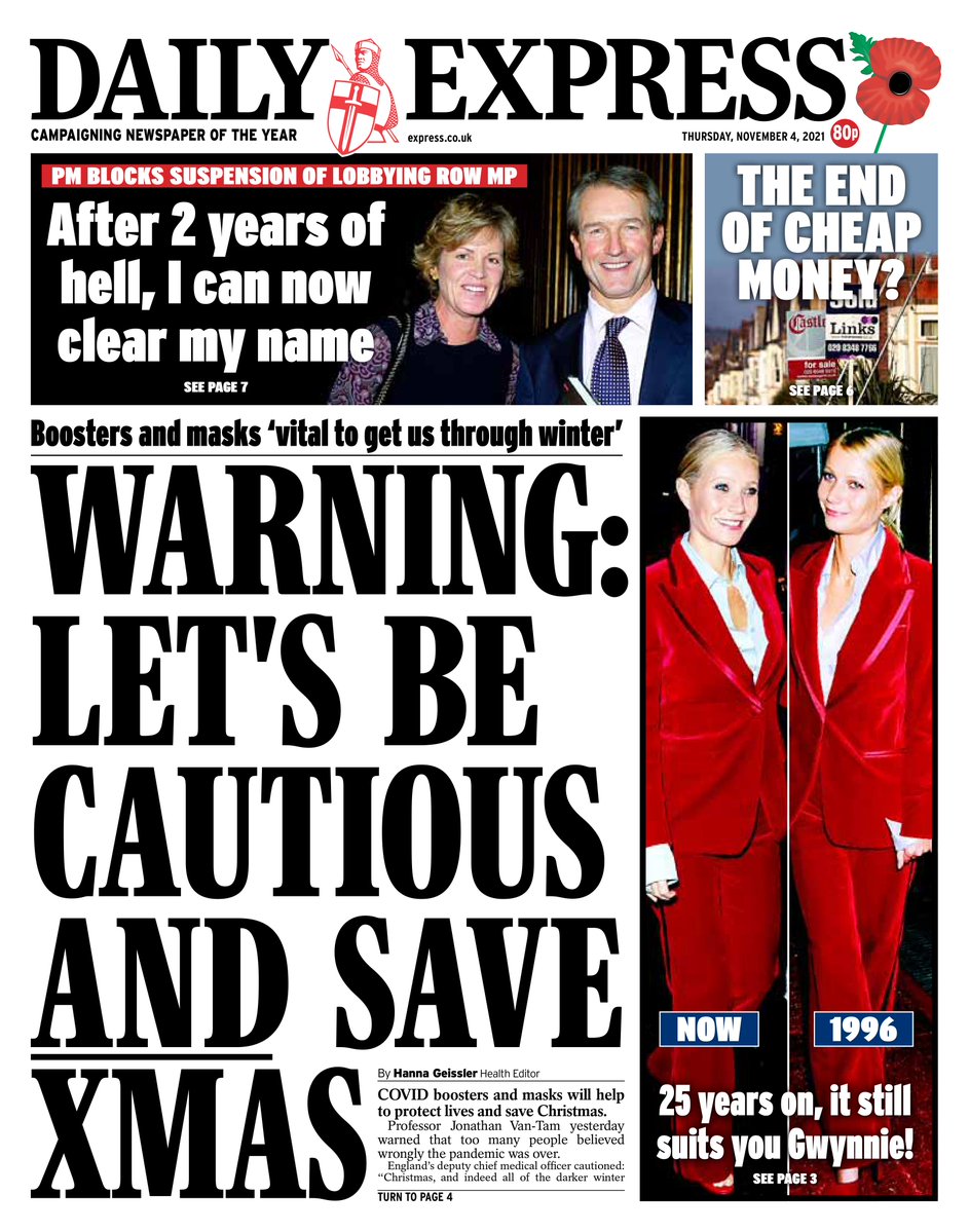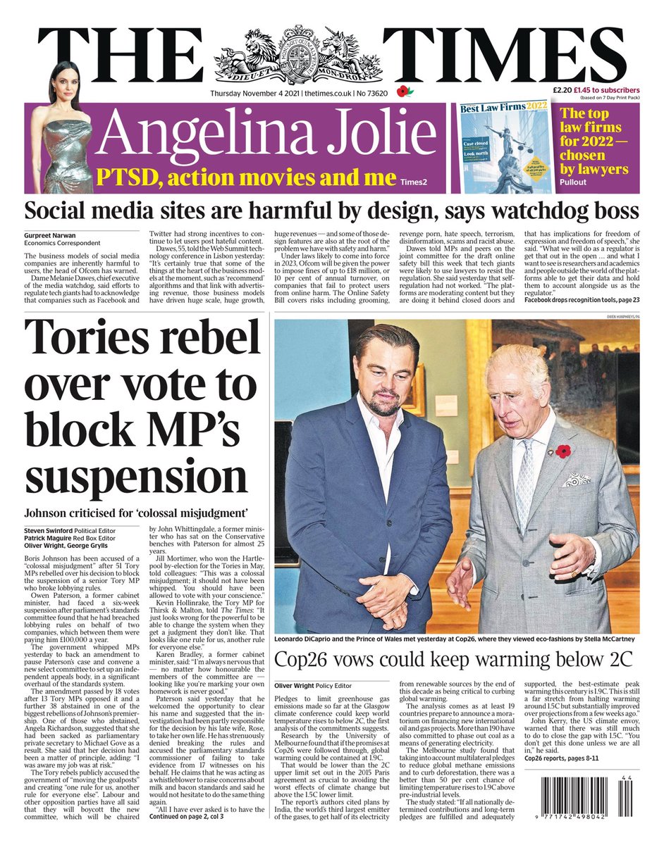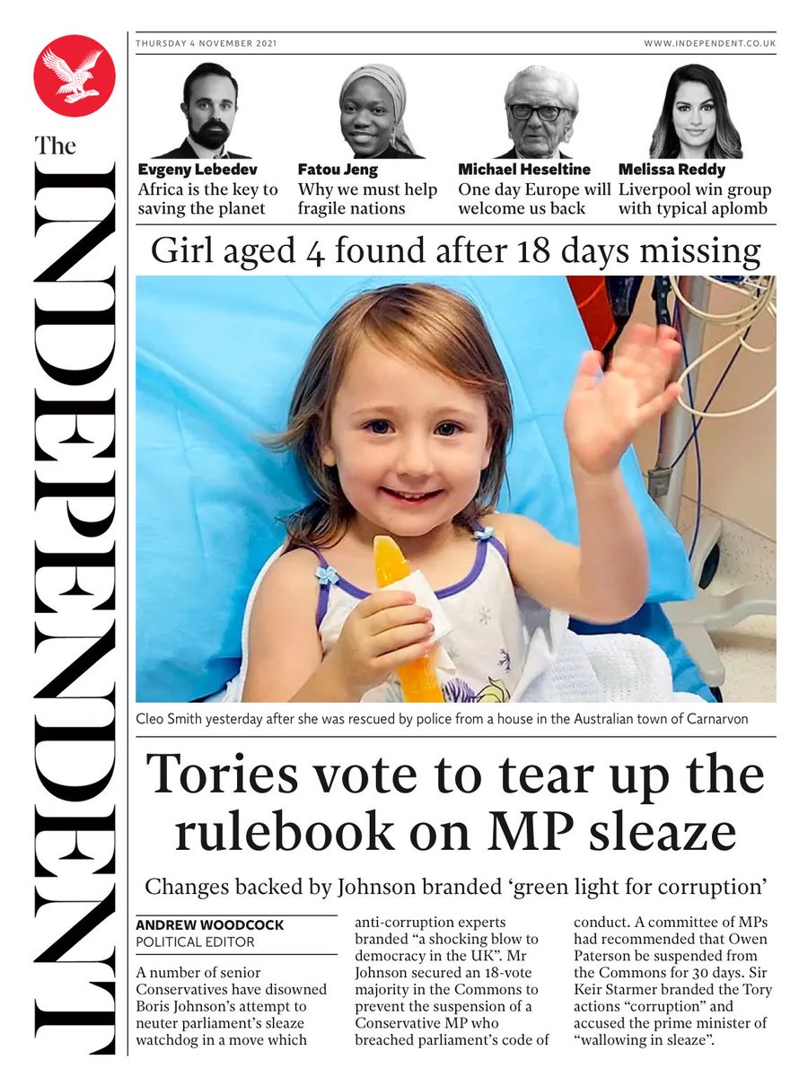 Boris Johnson protecting MP Owen Paterson, who was found to have repeatedly breached lobbying rules, from being suspended also makes the front page of The Guardian.