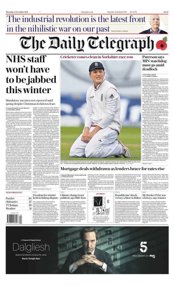 The Daily Telegraph writes that under plans being considered by ministers, NHS staff will not be forced to have the COVID vaccine this winter.