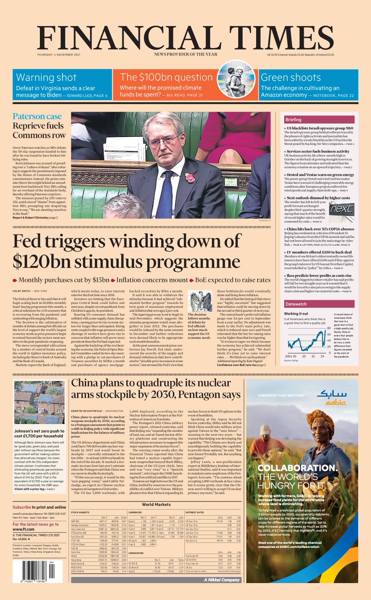 In the US, the Federal Reserve has said it will begin scaling back its $120bn monthly bond-buying programme this month, according to the front page of the Financial Times.