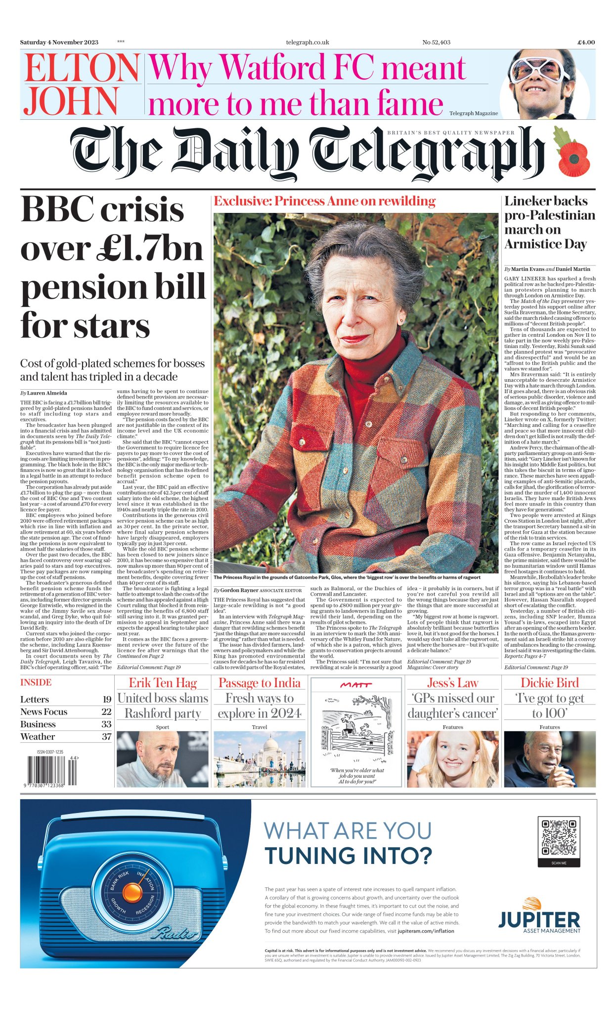 The Daily Telegraph reports on the BBC’s legal battle over a £1.7bn pension bill for its on-screen talent and executives.