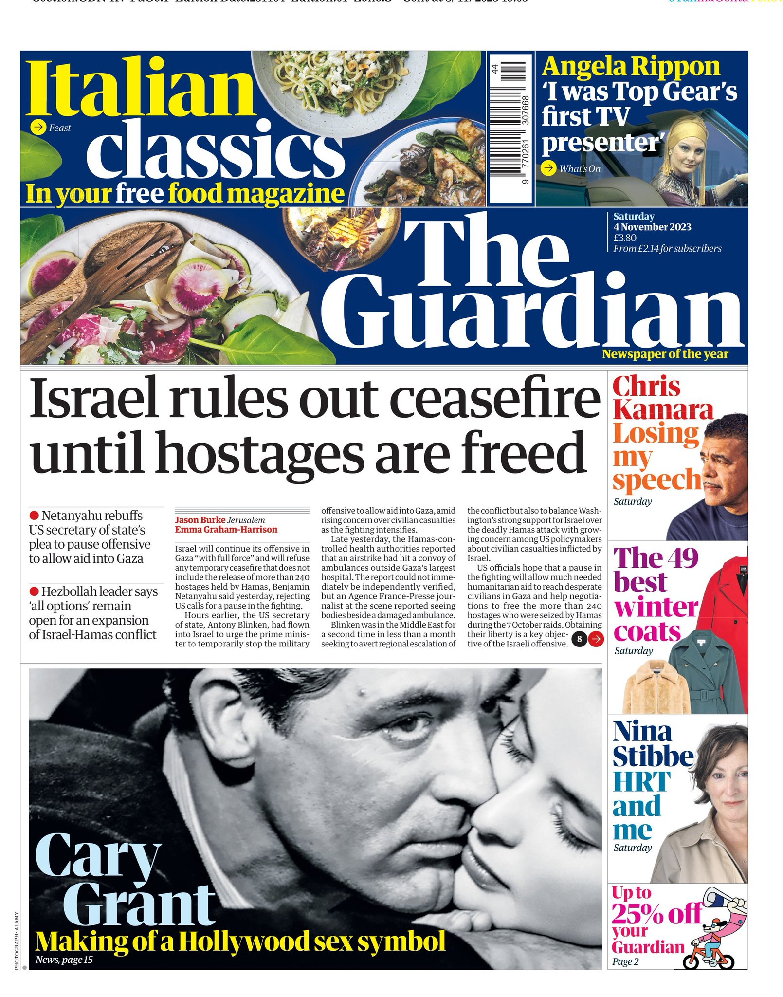 The Guardian reports Israel’s refusal to consider a ceasefire with Hamas until over 240 hostages are released.